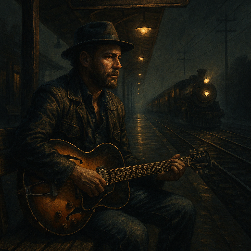 Instruments: Expressive electric blues guitar with emotional solos, warm piano chords, upright bass, slow steady drum groove with brushes, subtle organ for depth, Long guitar solo in the middle, with bends and sustained notes, Vocals: Deep, soulful male lead vocal, raspy and emotional, Tender and intimate in verses, powerful and raw in choruses, Occasional bluesy vocal ad libs, Mood: Heartbroken, smoky, and nostalgic, Evokes late-night blues clubs, heartbreak, and lonely train rides, Production: Warm, vintage-inspired mix with reverb on guitar and vocals, wide stereo for live feel, Focus on guitar expressiveness and emotional vocal delivery