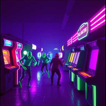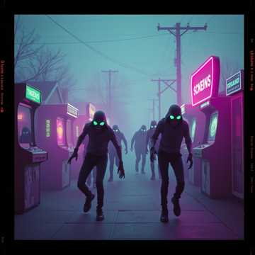 A spooky yet playful retro horror track with eerie 80s synths, Inspired by Zombies Ate My Neighbors, Stranger Things, and classic slasher films, Features haunted organ melodies, theremin-like tones, VHS-era analog synths, and fast-paced drum machines, The mood is fun but tense—perfect for a neon-lit monster chase through a haunted suburb, Mix B-movie camp with creeping dread and arcade nostalgia