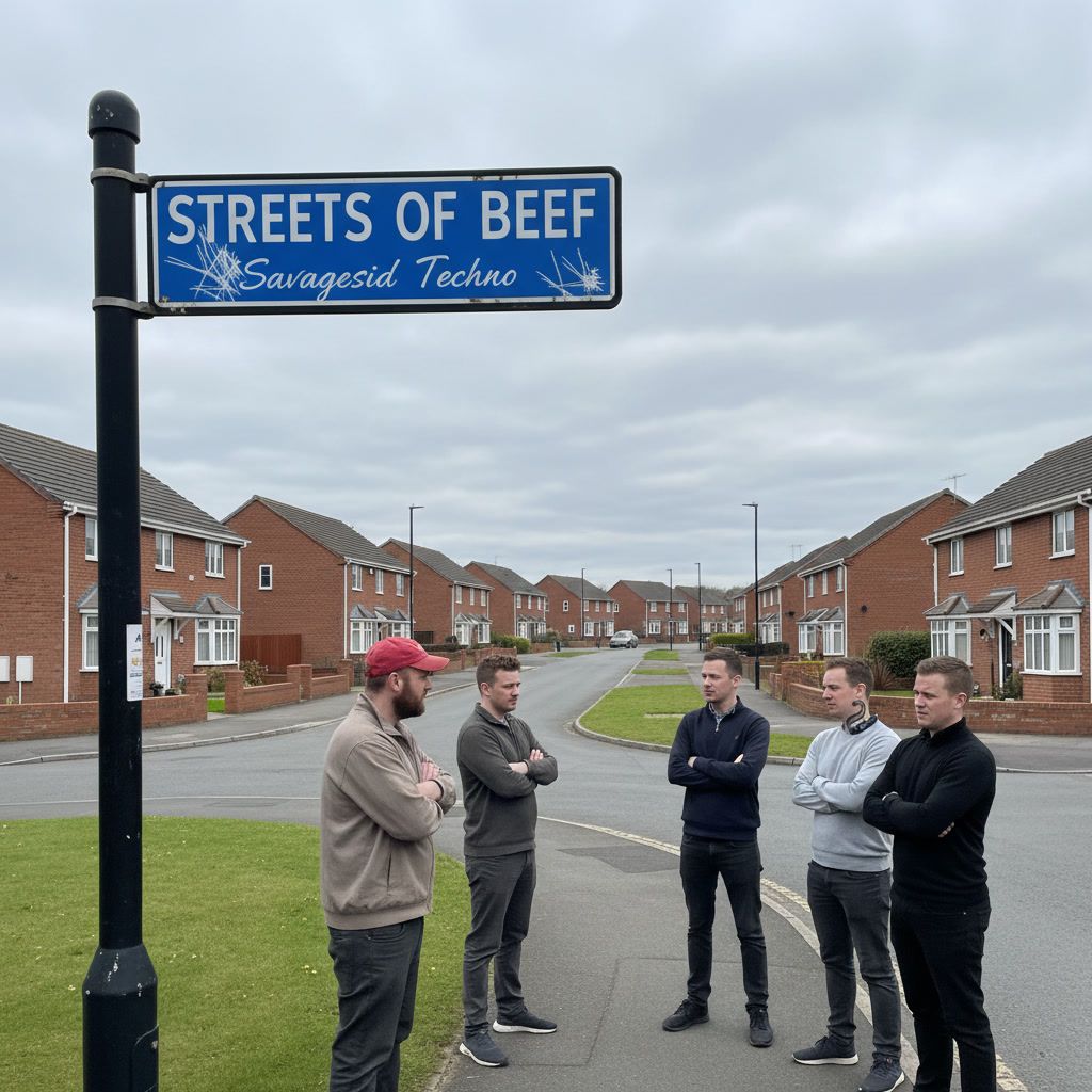A cheeky UK breakbeat/grime tune built around an ironic suburban theme-song intro soft, sentimental 80s/90s-style melody on clean electric piano and gentle strings, like an old cheerful TV intro about friendly neighbours, but twisted, chopped, warped, and flipped into a gritty breakbeat loop, Start with a bright, innocent jingle-style phrase, then pitch it, slice it, glitch it, and drop it into a heavy 140–150 BPM breakbeat with rumbling sub, dusty drums, and grimy MC bars about petty neighbour rivalries, Overall vibe is sweet suburban nostalgia vs dirty chaos, Playful, sarcastic an bouncy