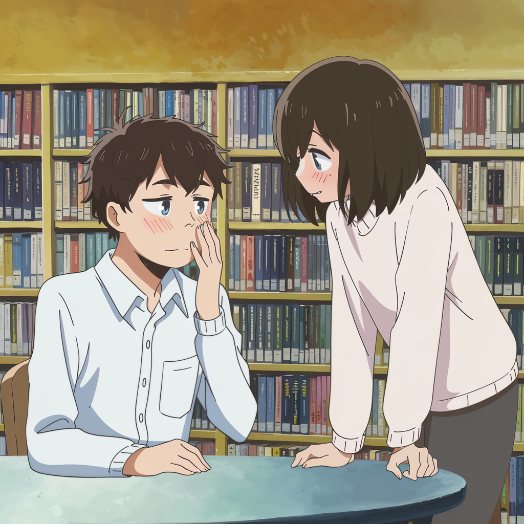 lofi, library ambience, soft whispers, gentle piano, romantic, dreamy, book sounds, intimate vocals, literary references, shy love, quiet atmosphere, female vocals, paper sounds, acoustic, poetic