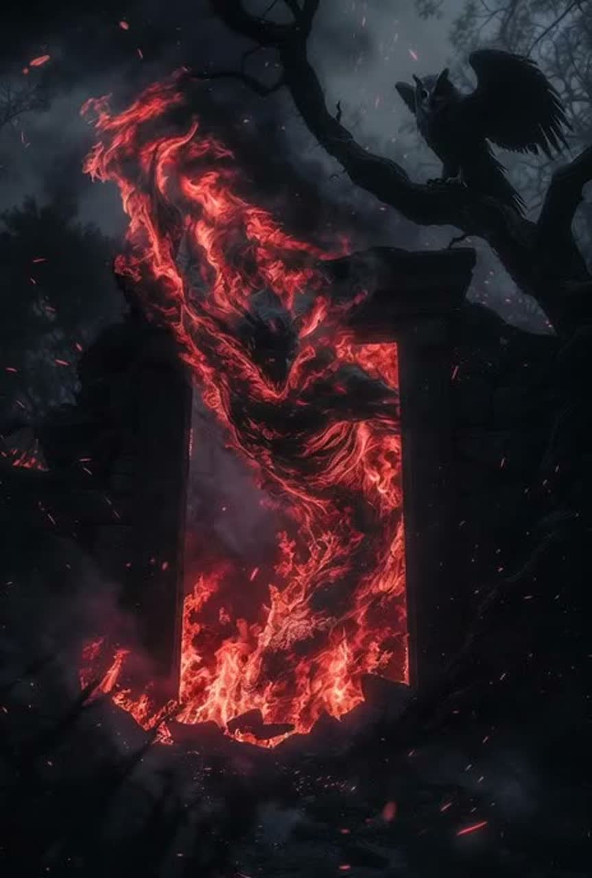 Dark symphonic metal, powerful gritty male lead vocal, massive orchestral arrangements, aggressive cinematic drums, low male choir chants, dark layered voice for fire creature, dramatic string swells, gothic atmosphere, intense and ominous tone, operatic chorus harmonies, heavy guitars throughout, epic fantasy soundtrack energy, tragic and morally intense ending, Tags: