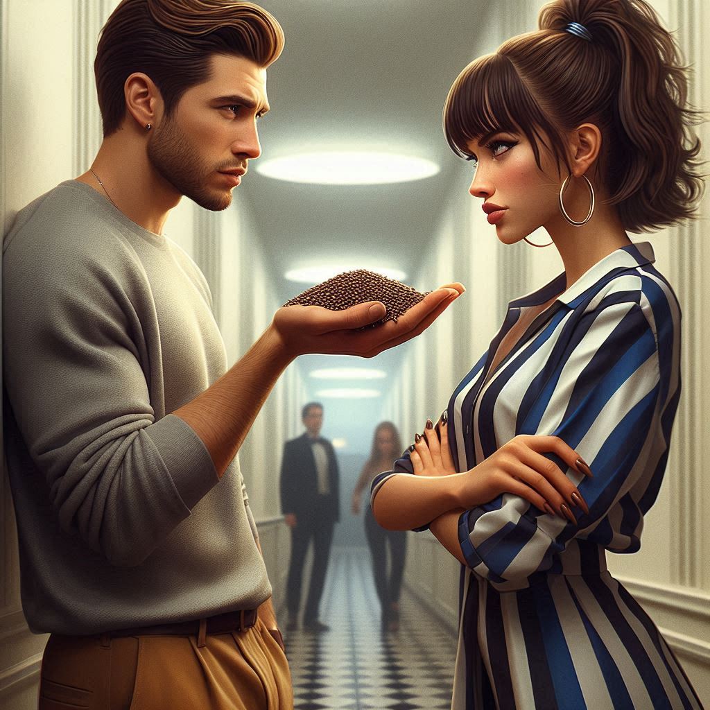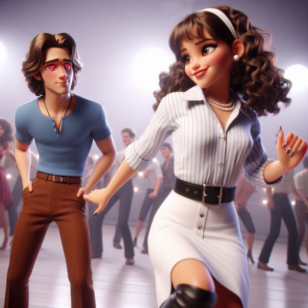 Upbeat retro pop/rock duet with 1950s and early 60s influences, Energetic and theatrical, Instruments include electric guitar with rhythmic riffs, upright bass, piano with rock’n’roll flair, saxophone accents, handclaps, and punchy drums, Male and female vocalists alternate verses and sing the chorus together in harmony, The mood is flirty, surprised, playful, and filled with admiration between both singers, Include a short instrumental intro, strong opening chorus, alternating verses, a dramatic bridge after the first chorus (not later), repeated chorus sections, and a bold instrumental ending, Vocal delivery should be full of character, with attitude, charm, and rising energy toward the final chorus, Think lively stage performance with dancing energy and old-school charisma