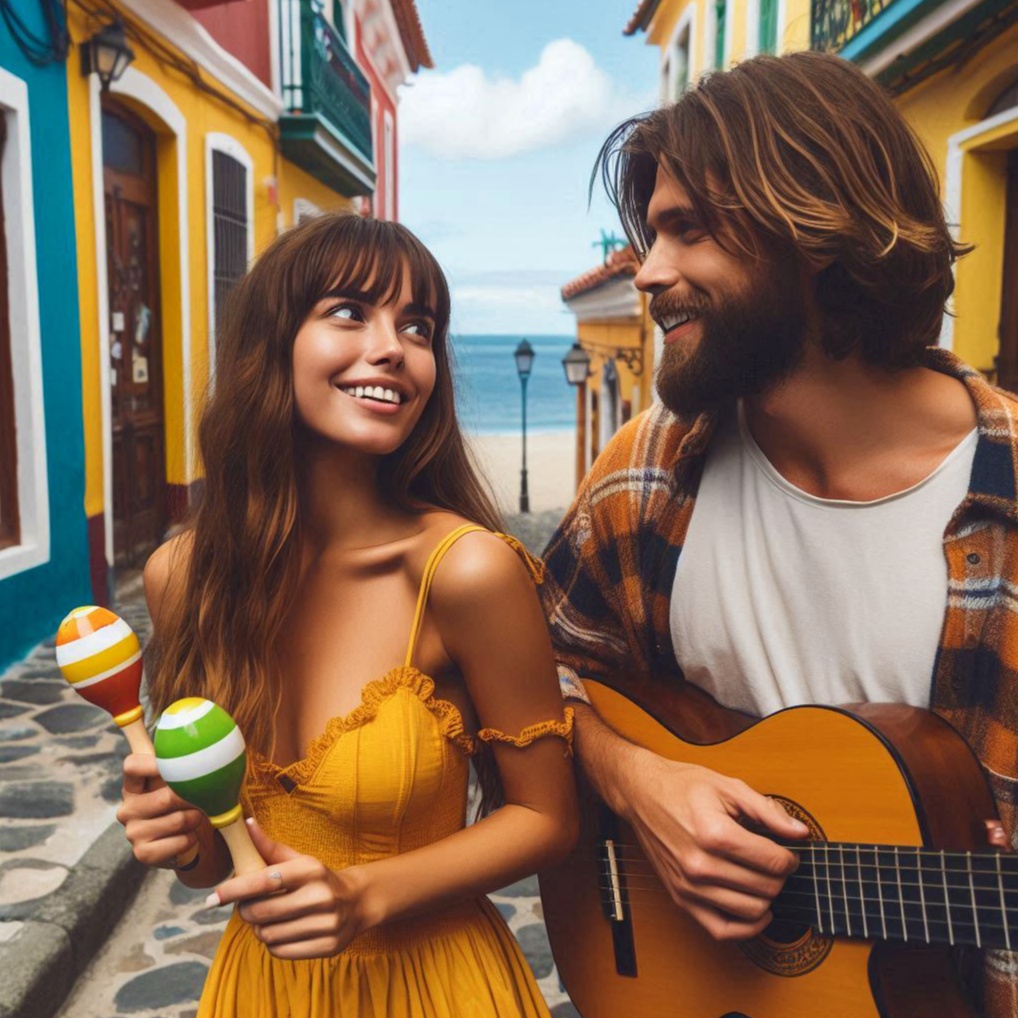 Bachata, flamenco, folk, jazz, romántica, contemporánea, guitarra, melódica, bongos suaves, bajo rítmico, latino, maracas, güiro, elegante, positiva, alegre, ritmo pegajoso