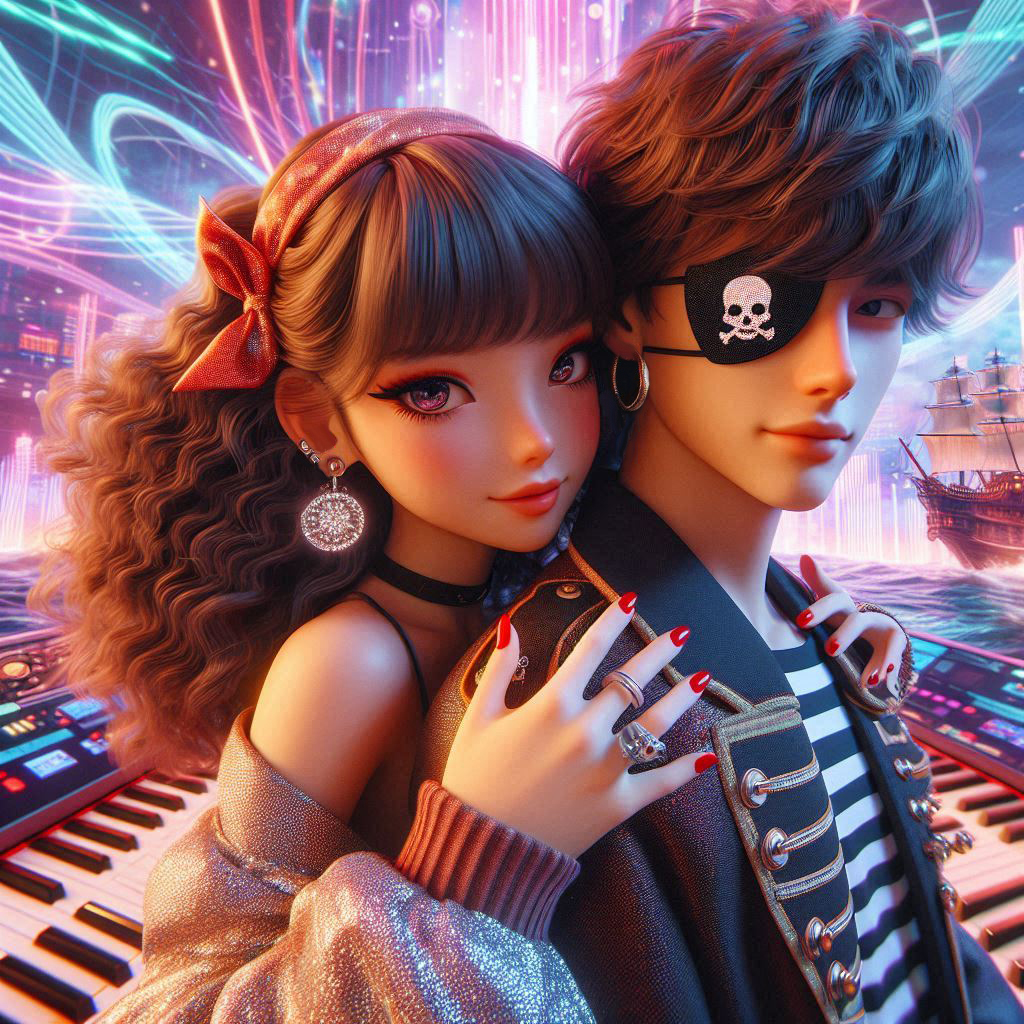 A medium-tempo 1980s-style song pirate synthpop, High-energy cinematic pirate adventure instrumental, Fast tempo (around 130-140 BPM), dramatic and uplifting orchestral composition with dynamic strings (especially staccato violins and cellos), bold brass fanfares, powerful timpani, and sharp snare drum rolls, Includes rhythmic string arpeggios, layered orchestration, sudden dynamic shifts, and an adventurous tone throughout, Emphasis on swashbuckling excitement and heroic tension, Structure builds from tense intro to an explosive, triumphant climax, Ideal for high-seas battles, treasure hunts, naval chases, and cliffhanger moments, A two female lead with a playful, theatrical spoken-sung delivery—clear, with ironic flair and a neutral Iberian Spanish accent—sails over the texture, The verse-chorus form and sticky topline keep it infectious, marrying new wave, electro-pop, disco, and techno-pop elements in a crisp, expressive arrangement