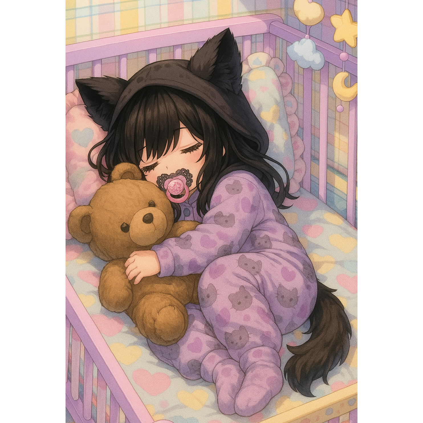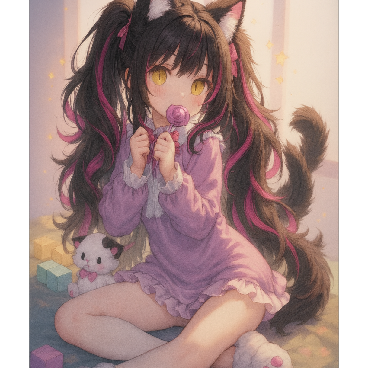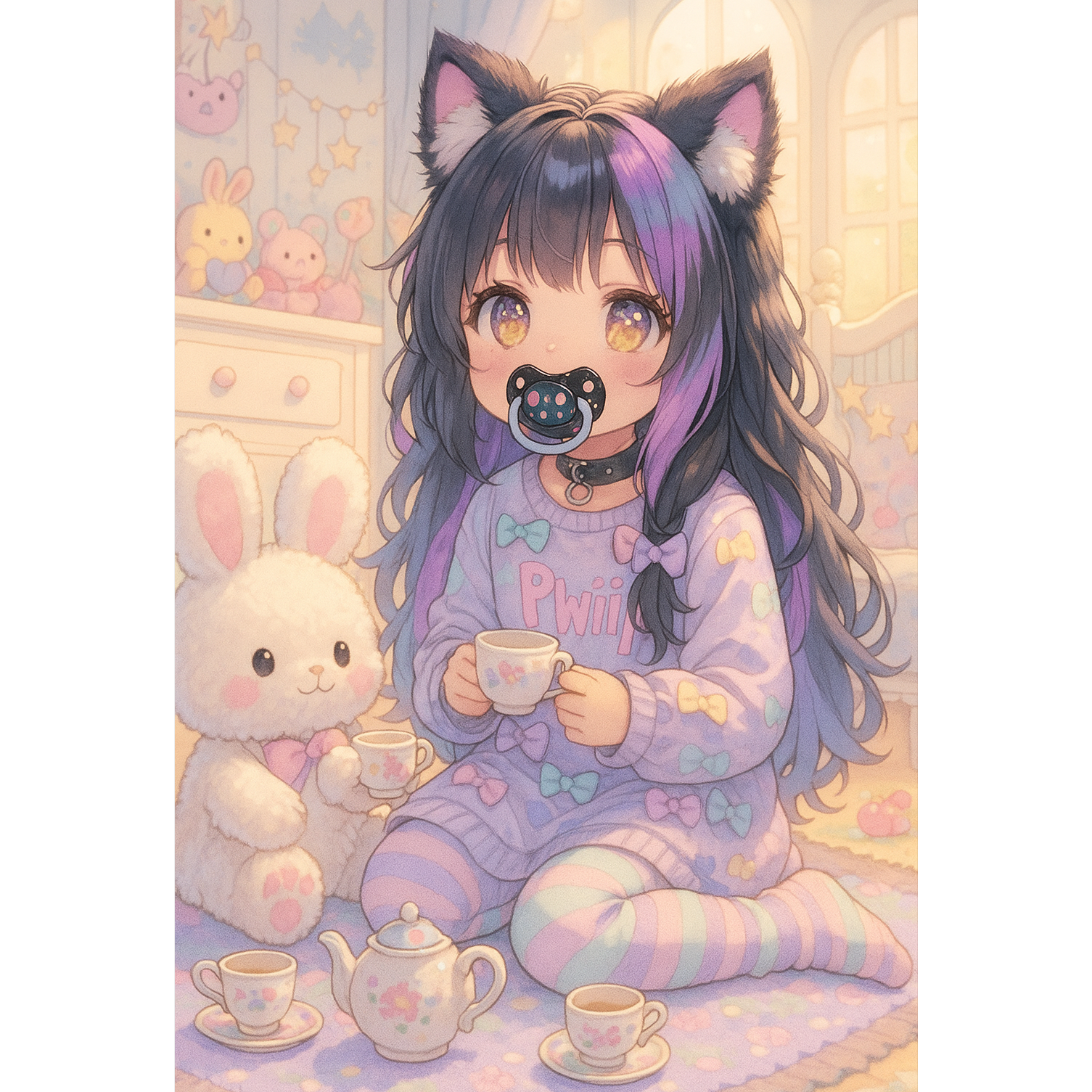 A kawaii alt pop lullaby blending darkwave synth pads and playful music box melodies, with bright, cute piano leading the verses, Toy percussion clicks and chimes dance around fingerpicked acoustic guitar, Twinkling textures and gentle bass create a dreamy, childlike atmosphere throughout