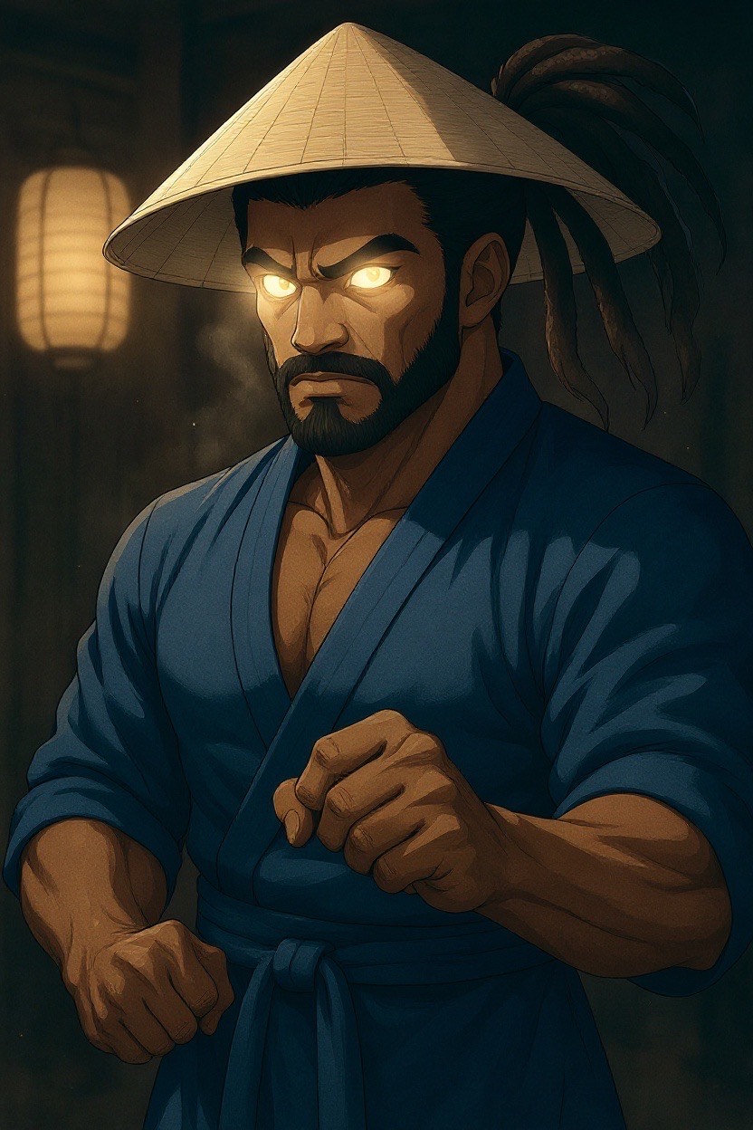 Japanese Soul Funk / Cinematic Showdown Legend – 110 BPM (E minor), Male narrator with warm, soulful grit (Teddy Swims tone) recounts a tavern clash between a blind Grandmaster of Rhythm and five reckless youths, Taiko = bass heart; tsuzumi = footwork; shamisen = blade-guitar pulse; koto = spark; shakuhachi = breath, Three vocal layers: narrator, bar crowd (street-funk slang), dojo spirits (“HYAH!”, “SOUL!”, “BALANCE!”), Groove balanced between funk and zen — swagger meets stillness, Mood: cinematic, disciplined, groovy, wholesome, One bar of silence follows the fifth beat