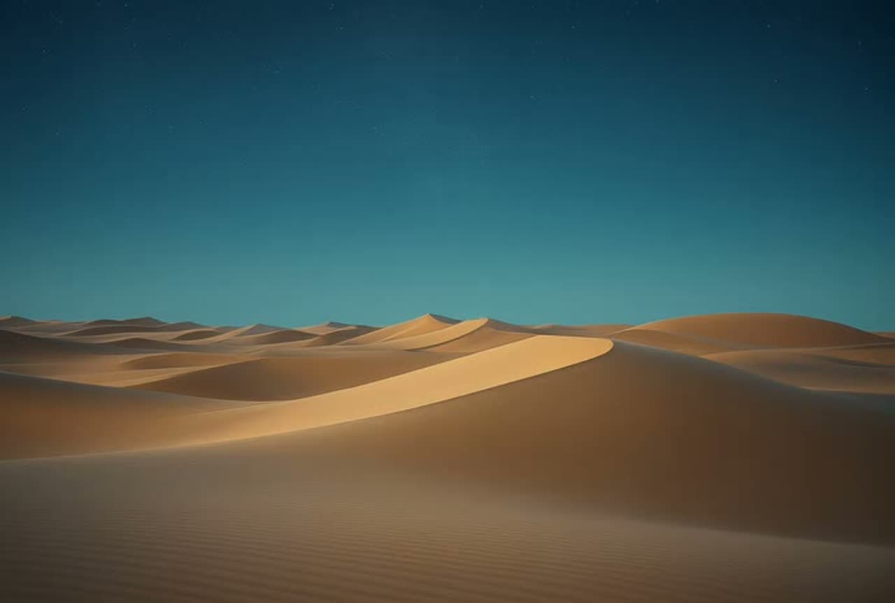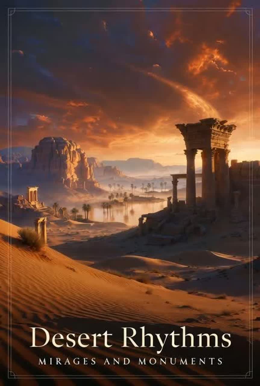 Instrumental world fusion with desert-inspired rhythms and atmospheric textures, Deep hand percussion (frame drums, darbuka, shakers) layered with spacious reverb, airy synth pads, and haunting oud/guitar motifs, Evokes the vastness and mystery of arid landscapes—hypnotic, cinematic, and immersive, with a steady pulse that feels both ancient and timeless