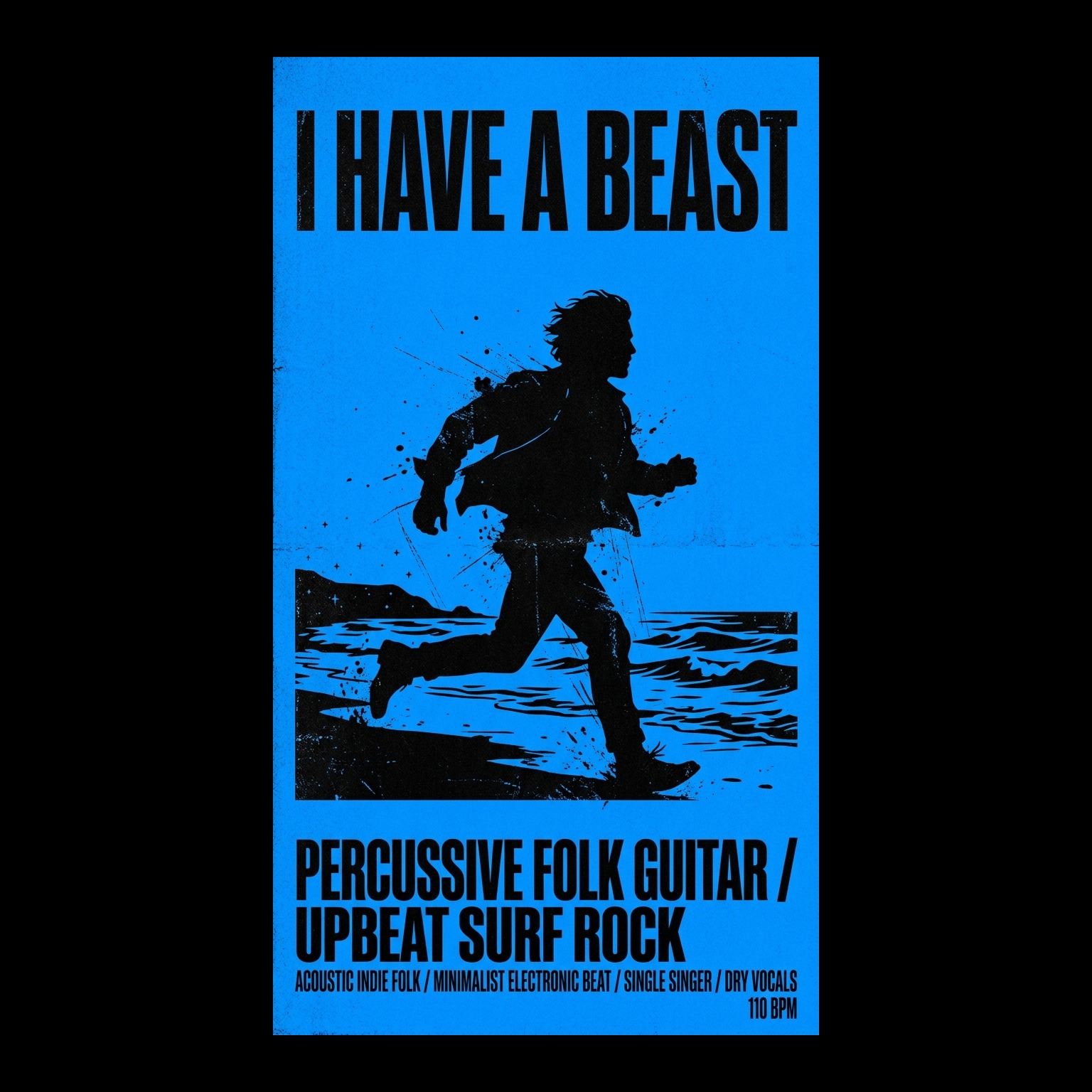 Acoustic Indie Folk, Upbeat Surf Rock, Minimalist Electronic Beat, Percussive Folk Guitar, Solo Male Voice Only, Dry Vocals, 110 BPM, No backing vocals, No harmonies, Single singer