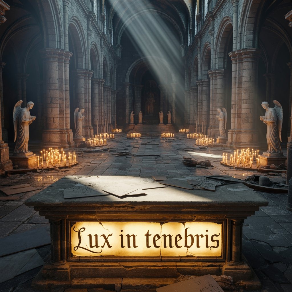 Gregorian Latin chant, Gregorian mode, trap beats with lute melodies and 808s male choir, cathedral reverb, cathedral echo, sacred tone, Gregorian chants, ambient pads, cinematic stillness