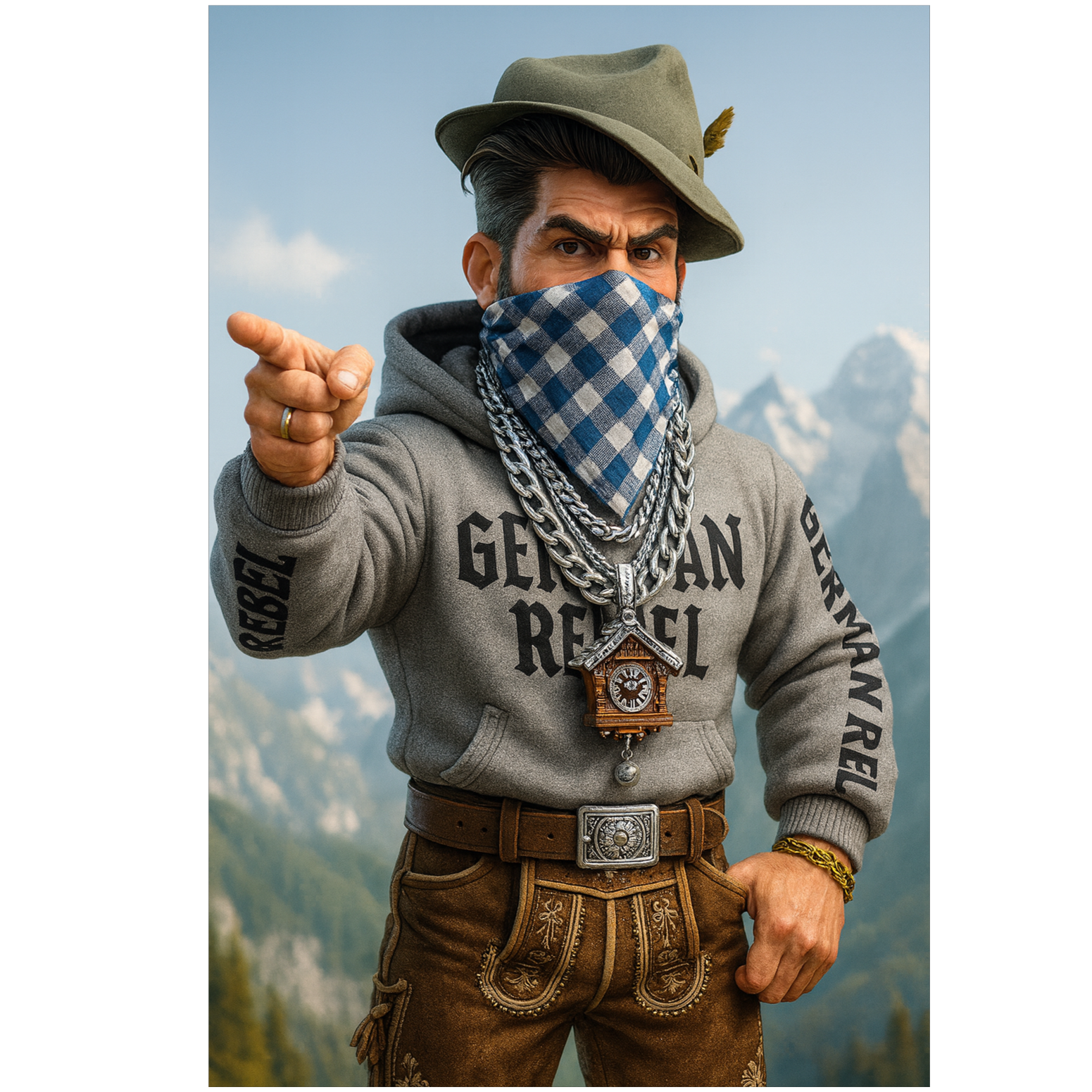 a gritty underground boom bap beat layered with vinyl crackle and dusty drum loops sets the foundation yodel parts interweave with rhythmic punchlines giving a surreal alpine flavor electric guitar solos slash through the beat with distorted bluesy riffs adding intensity and rawness vocal flow alternates between aggressive bars and melodic yodel breaks creating contrast and surprise the overall vibe is both nostalgic and experimental blending golden era hip hop structure with unconventional alpine and rock fusion elements perfect for a head-nodding yet mind-bending sonic experience, ‑female voice