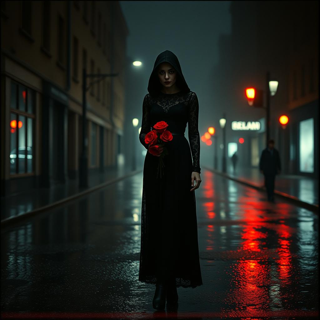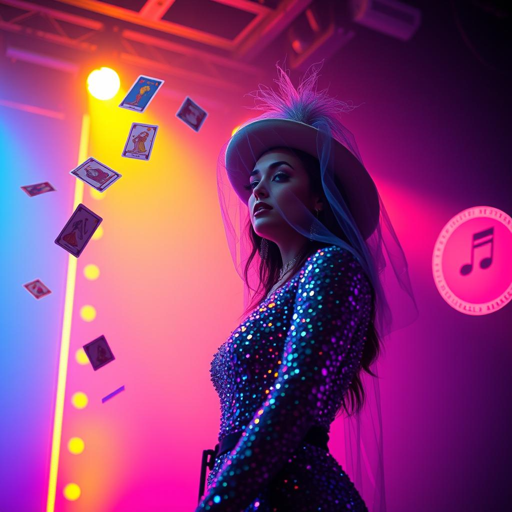 dramatic Techno, Dramatic Electro-Pop, Dark Electro Pop, Glam Dance, Sexy, gefährlich, mysteriös, hypnotisch, Punchy retro synths, dark pulsating bass, whispered adlibs, spell-chants, cinematic FX, Vocal Style: Theatrical, breathy and commanding