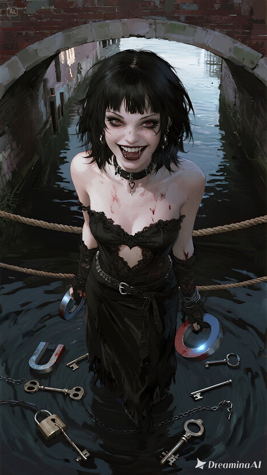 Dark surreal French post-punk in the style of Vera Choke, Gritty bass with chorus distortion, metallic drum hits, deep cold reverb, and darkwave synth pads, Add subtle water sounds, dragging chains, clinking metal, and distant industrial textures, Vocals: smoky, sharp, emotional, half-whispered, half-feral, with haunting harmonies in the chorus, Atmosphere: nocturnal waterfront, magnet fishing as ritual magic, Cinematic, brooding, poetic, slightly unhinged but full of admiration for the treasure-hunters Quentin & Baptiste, Mood: mysterious, rebellious, dreamlike, magnetic