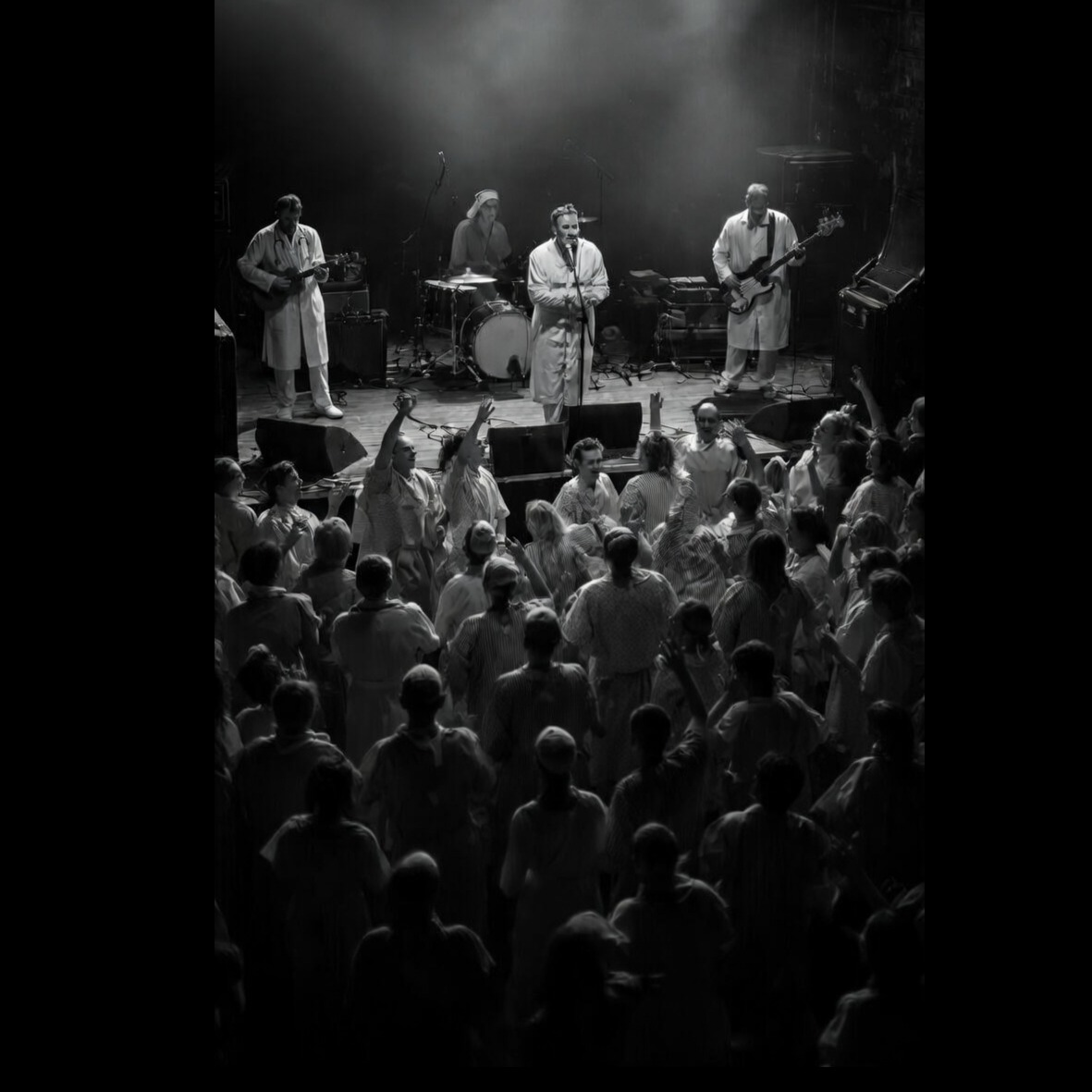 Live performance in a small club, acoustic concert, acoustic bedroom life-performance sound, а dark, unplugged, subtle reverb, dark atmosphere, acoustic ukulele palm-muted, stereo layered with subtle solo instrument hooks, The song is in a minor key with a moderate tempo around 110 BPM, The male vocals are raw, crispy, hoarse, ranging from a low, melodic baritone in the verses, calm but melodic in chorus, raw delivered dark melancholic style vocals, The production is raw and intimate, with a focus on the natural voice and ukulele resonance