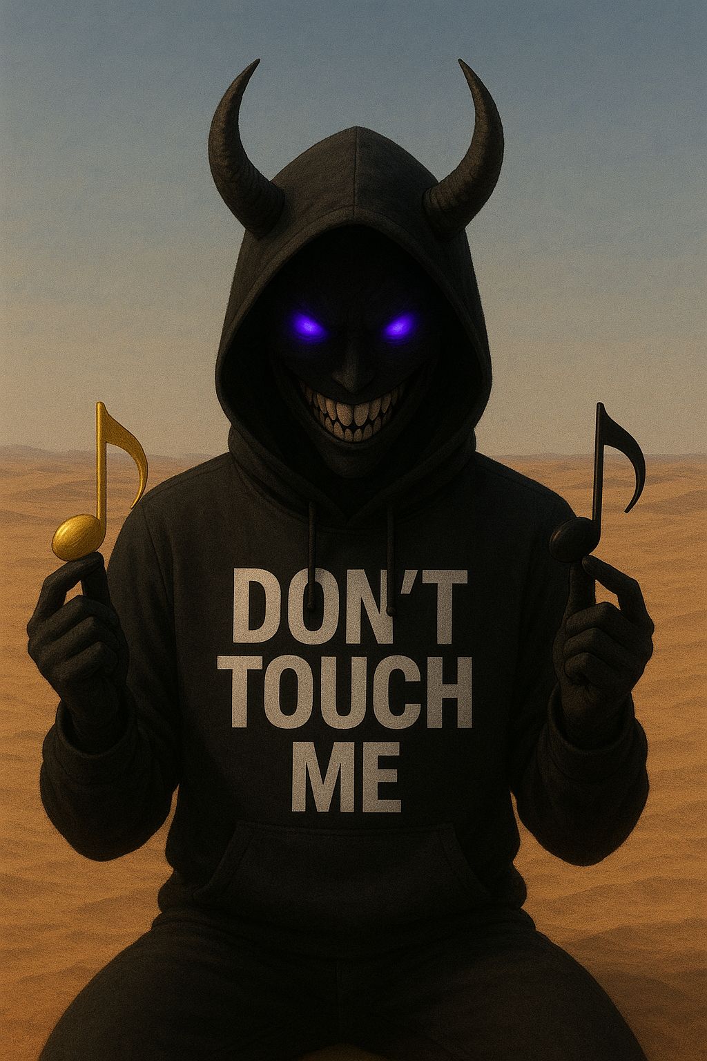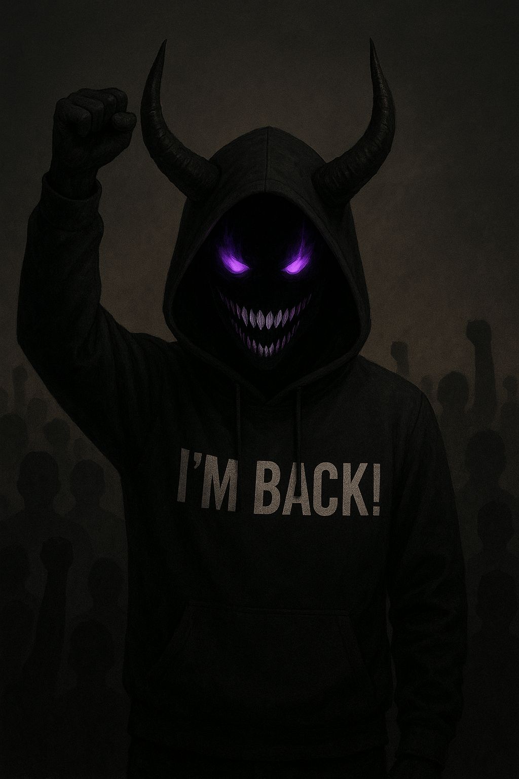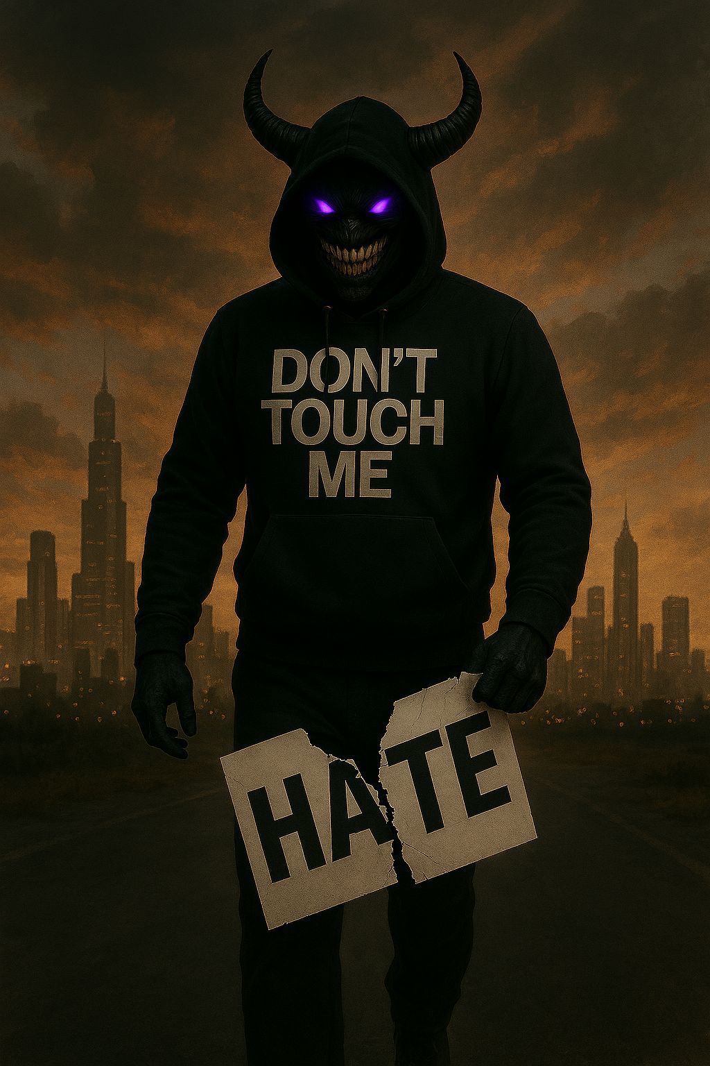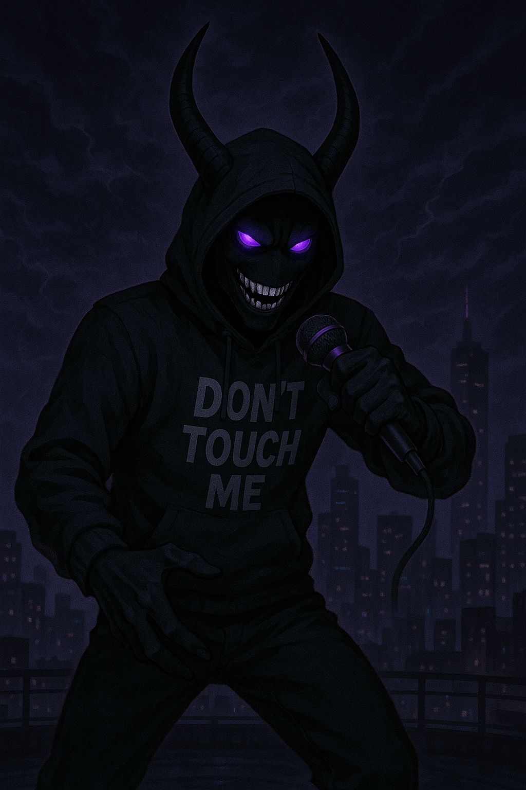 Rap Rock Trap Metal fusion, Heavy 808s and live bass collide with distorted electric guitars and pounding rock drums, Trap hats tick over eerie synth pads and cinematic risers, Male vocals trade gritty rap verses, gang chant ad libs, and anthemic rock metal choruses with soaring aggression, Manic laughter in parentheses echoes with reverb, Production is thick and stadium ready, with distortion, layered harmonies, and dark atmospheric textures, Mood is aggressive, psychotic, rebellious, and hauntingly anthemic