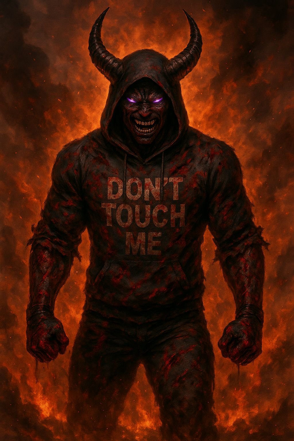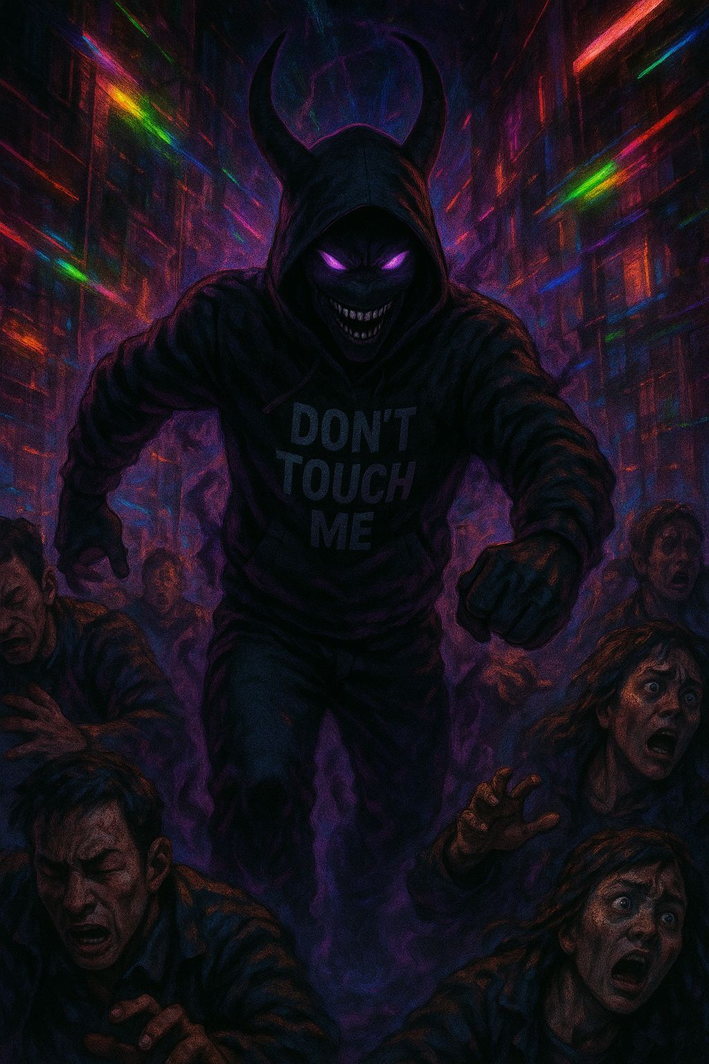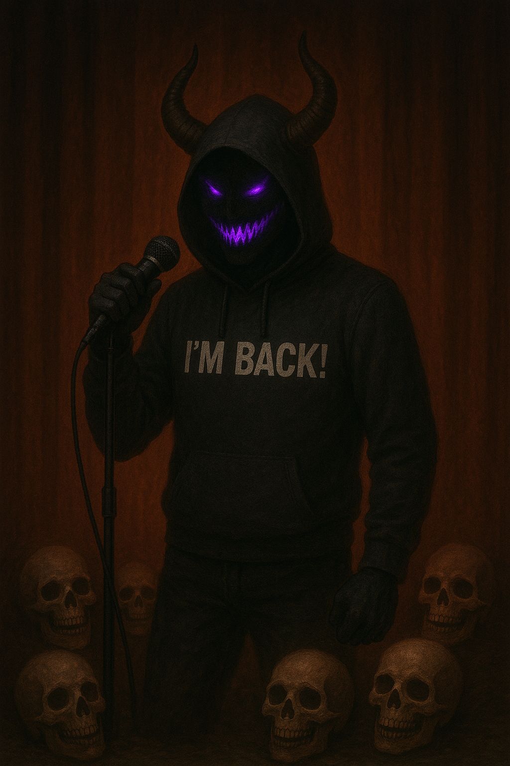 Rap Rock Trap Metal fusion, Heavy 808s and live bass collide with distorted electric guitars and pounding rock drums, Trap hats tick over eerie synth pads and cinematic risers, Male vocals trade gritty rap verses, gang chant ad libs, and anthemic rock metal choruses with soaring aggression, Manic laughter in parentheses echoes with reverb, Production is thick and stadium ready, with distortion, layered harmonies, and dark atmospheric textures, Mood is aggressive, psychotic, rebellious, and hauntingly anthemic