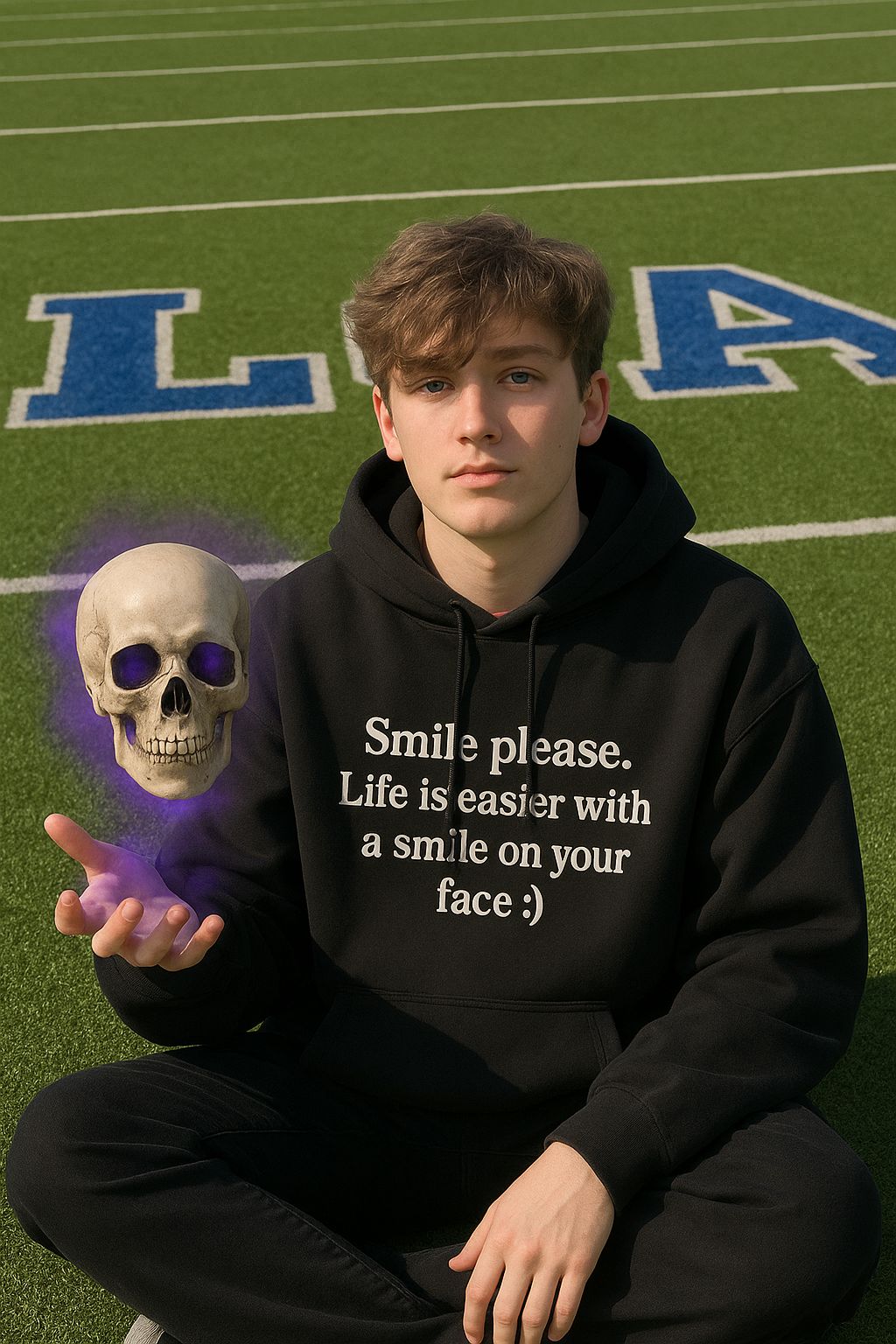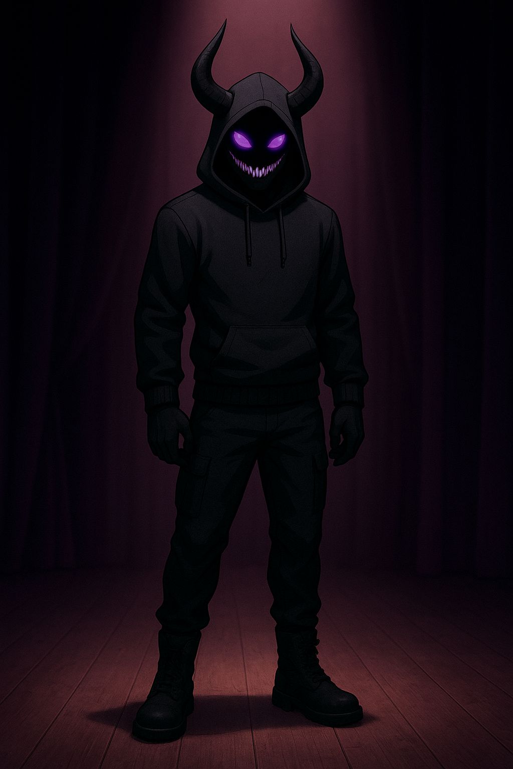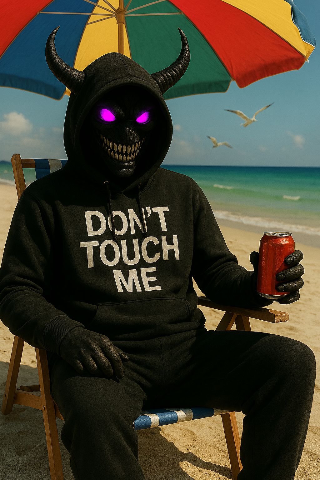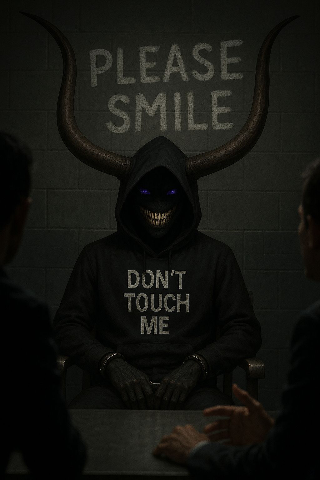 Rap Rock Trap Metal fusion, Heavy 808s and live bass collide with distorted electric guitars and pounding rock drums, Trap hats tick over eerie synth pads and cinematic risers, Male vocals trade gritty rap verses, gang chant ad libs, and anthemic rock metal choruses with soaring aggression, Manic laughter in parentheses echoes with reverb, Production is thick and stadium ready, with distortion, layered harmonies, and dark atmospheric textures, Mood is aggressive, psychotic, rebellious, and hauntingly anthemic