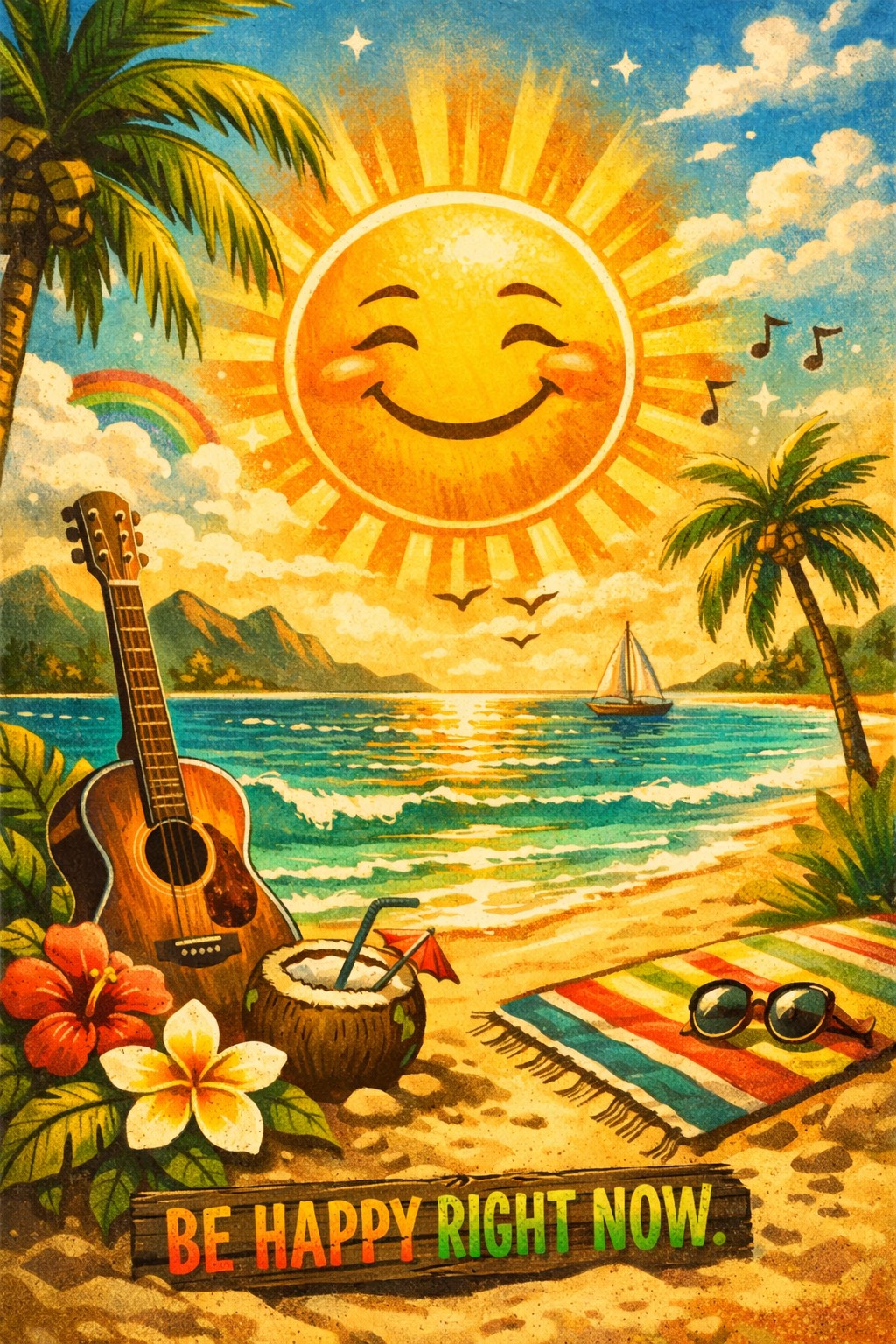 -back 90s ska-reggae groove with a sun-washed, beach-day feel, Mid-tempo, relaxed but bouncy rhythm, Warm electric bass with melodic movement, clean electric guitar playing off-beat chords with light reverb, subtle lead guitar fills, and easygoing drum groove with a loose, human feel, Male lead vocal, casual and conversational, slightly gritty but relaxed, like storytelling with a smile, Choruses include soft background singers adding harmony and warmth, Include a musical break featuring a playful steel drum solo that feels improvised and joyful, Overall mood is carefree, grateful, unhurried, and nostalgic — sunshine, coffee, nothing to worry about, just enjoying the day, soul, hip hop, male vocals, uplifting