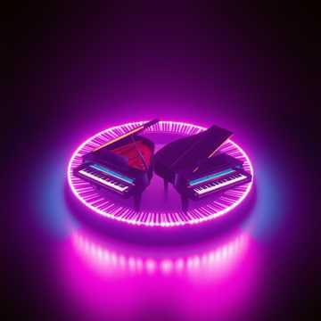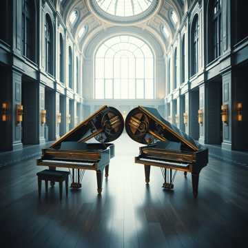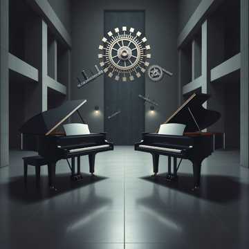 math rock, prepared or clean piano ensemble, two-piano interplay, left-right rhythmic counterpoint, percussive and technical piano articulation, asymmetrical phrasing, interlocking rhythmic patterns, circular melodic motion, partials slightly detuned, non-resolving harmonic field