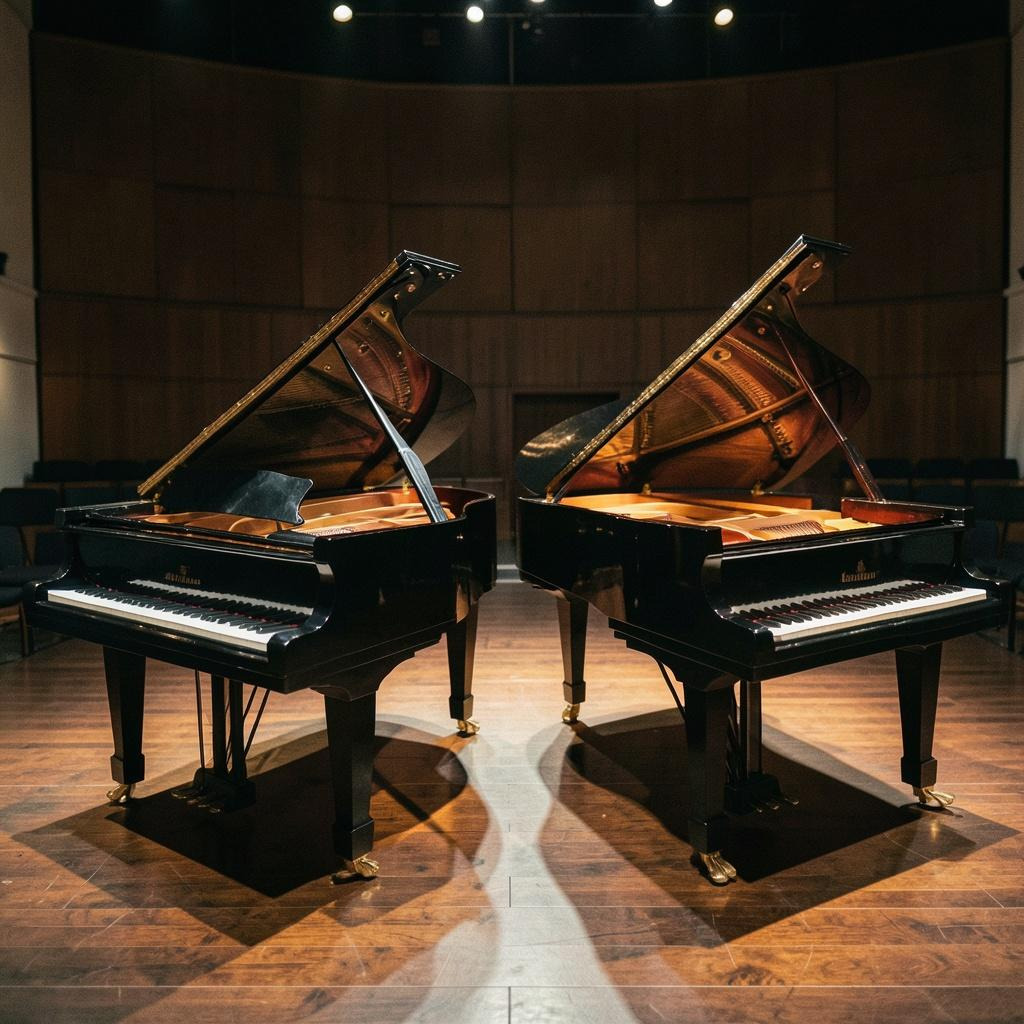 Instrumental Live Performance, Two Grand Pianos, Math Rock Style, Intricate Rhythmic Patterns, Interlocking Piano Parts, One Piano Percussive And Rhythmic, The Other Melodic And Flowing, Concert Hall Setting, Medium-Sized Venue, Clear Natural Acoustics, Warm Reverb, Precise Timing, Controlled Dynamics, Instrumental Only, No Vocals, No Singing, No Voice, Subtle Audience Presence, Quiet Attentive Audience, Minimal Noise, Immersive And Detailed Sound, Refined And Modern Classical Crossover, Not A Stadium, Not An Arena