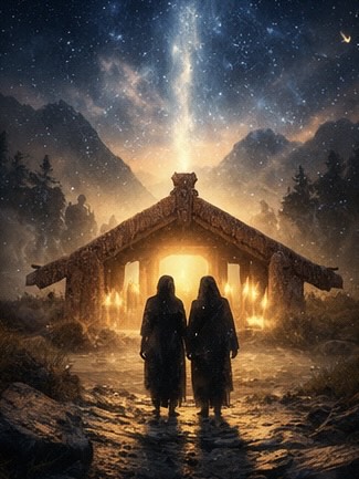 Style: cinematic Māori ambient, taonga pūoro, deep ancestral choir, slow heartbeat drum, distant pūtātara horn, soft wind and ocean textures
