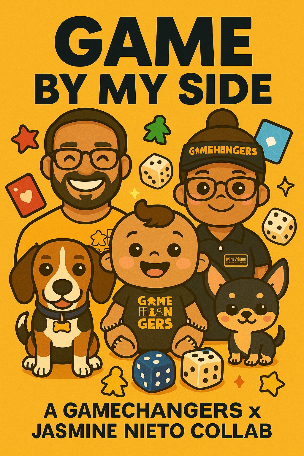 High-energy kids-game commercial jingle, Fast pop beat (150â165 BPM), Playful percussion, claps, xylophone, whistle hits, big group vocals, Sound effects throughout: cards slapping, dice rolling, baby babbles, puppy yips, giggles, cheering, Fun, animated, rhythmic vocals