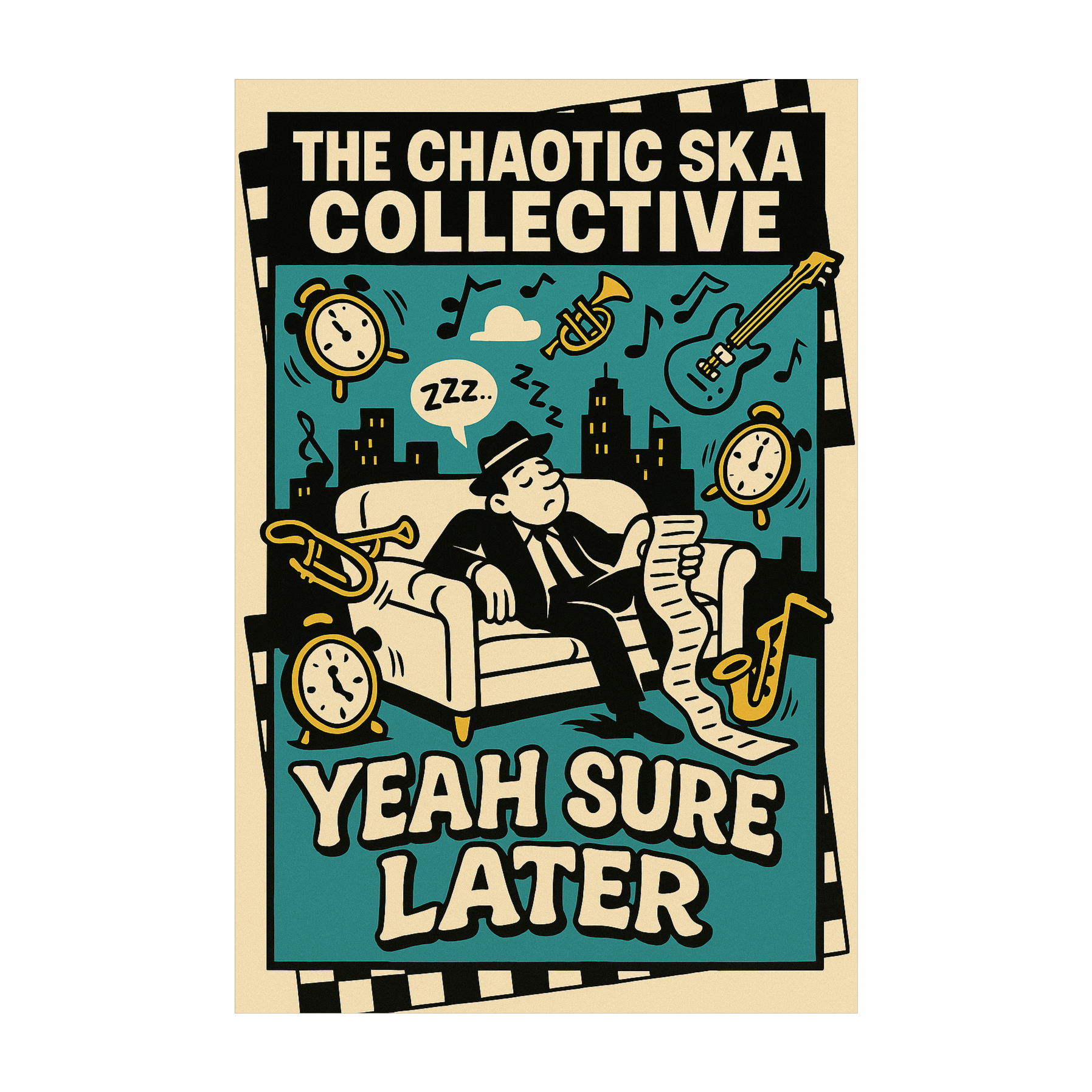 A laid-back ska groove at 90 BPM with a classic one-drop drum beat, warm and funky bass as the anchor, offbeat skanking guitar, and a ghostly Hammond organ that drifts in and out, Muted horns add soft brass textures, Vocals are low, dry, semi-spoken with a relaxed Southern English lilt, slightly behind the beat, using stretched-out phrasing that bends into the dub groove, The atmosphere is hypnotic and detached, radiating a “do it later” energy, Choruses feature layered, overlapping vocals; the track closes with a dub-style fade, whispering ad libs over swirling instrumentals