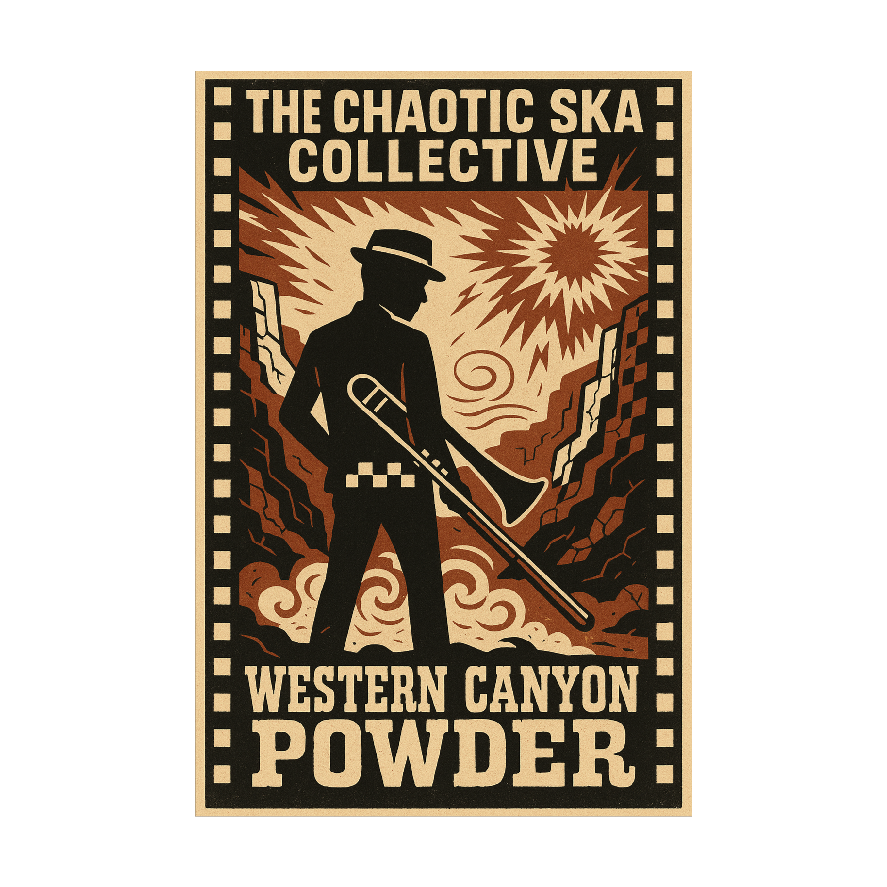A dub-ska instrumental at 90 BPM with one-drop drums, walking bassline, and sharp offbeat guitar chops, Chitarra spaghetti western twang plays bold, reverb-soaked riffs like desert fanfares, Brass (trumpet, trombone, baritone sax) echo as heroic calls, alternating between mariachi-style stabs and dub delays, Farfisa/Hammond organ swells create noir atmosphere, swirling like desert wind, Dub FX (delay, echo, reverb) add cinematic depth, evoking ghost towns and fading radio signals, Structure: Intro (guitar twang + brass fanfare), Verses (bass + organ groove, brass phrases), Bridge (dub breakdown, echo guitar + trombone), Final section triumphant brass layered with guitar, Outro fading into reverb + desert wind FX