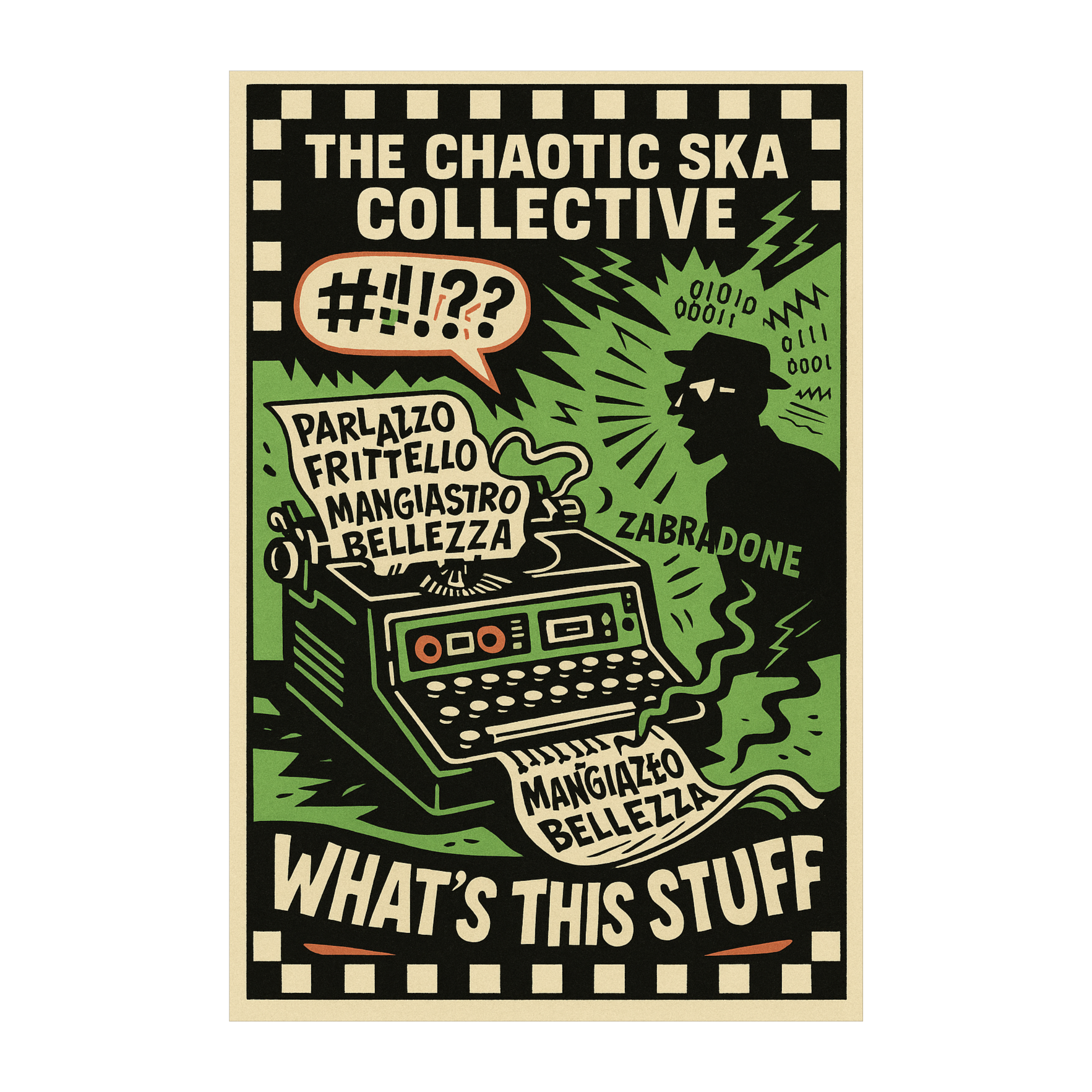 A roots reggae / dub ska track with live band sound, no EDM, no synths, One-drop drums in the style of The Specials, funky walking bass like Sly & Robbie, offbeat guitar chops in the style of The Selecter, ghostly Farfisa organ lines like Madness, and brass stabs inspired by The Skatalites, Male lead vocal: spoken-sung with a dry Italian accent, ironic and detached tone, Zabradone: secondary male voice, glitchy baritone with rude boy inflection, dub FX, patois-inspired toasting, Appears in breakdowns and outro with [ZABRADONE] tag, Structure: Intro, Verses, Choruses, Dub Breakdown with [SYSTEM OVERLOAD EFFECT], Bridge, Final Chorus, Outro with spoken fade