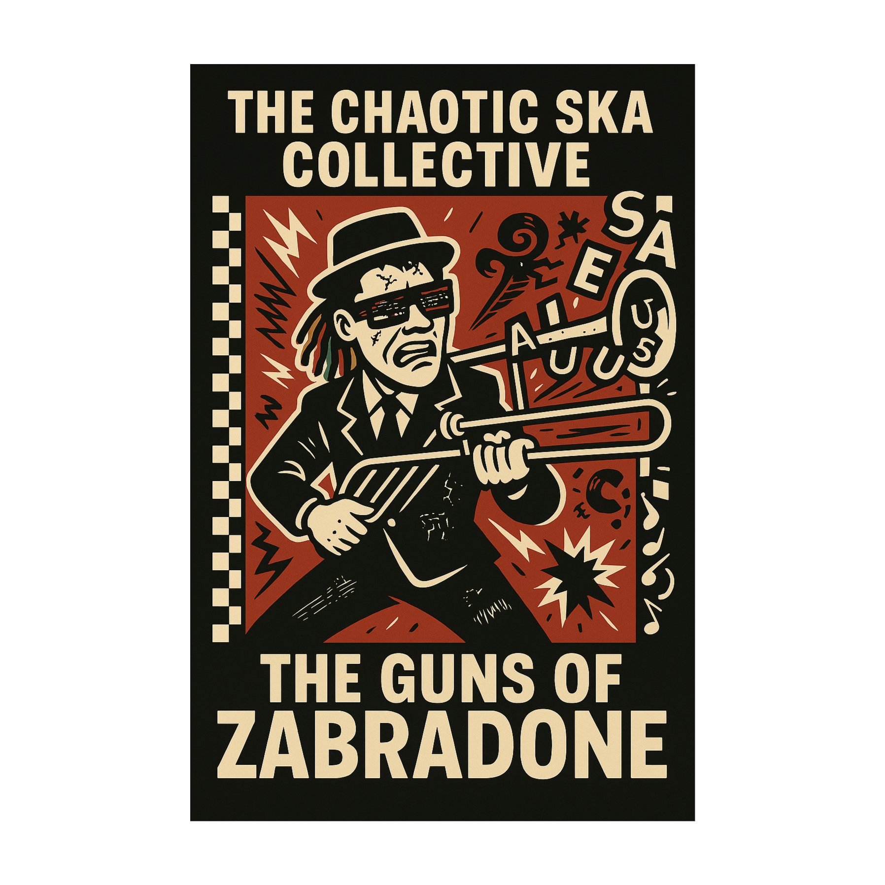 Militant dub-ska at 95–100 BPM: punches in with one-drop drums, bass-heavy dub with ska horns (trumpet, trombone, bari sax), staccato offbeat guitars, pulsing Farfisa, fire tight, echo-soaked bursts, Lead voice Zabradone delivers pure patois toast, dub delay, militant cadence, words weaponized, Dub FX (delay, reverb, echo) amplify tension in breakdowns, never flooding the rhythm, Final chorus slows and intensifies, outro dissolves through brass trails and tape delay