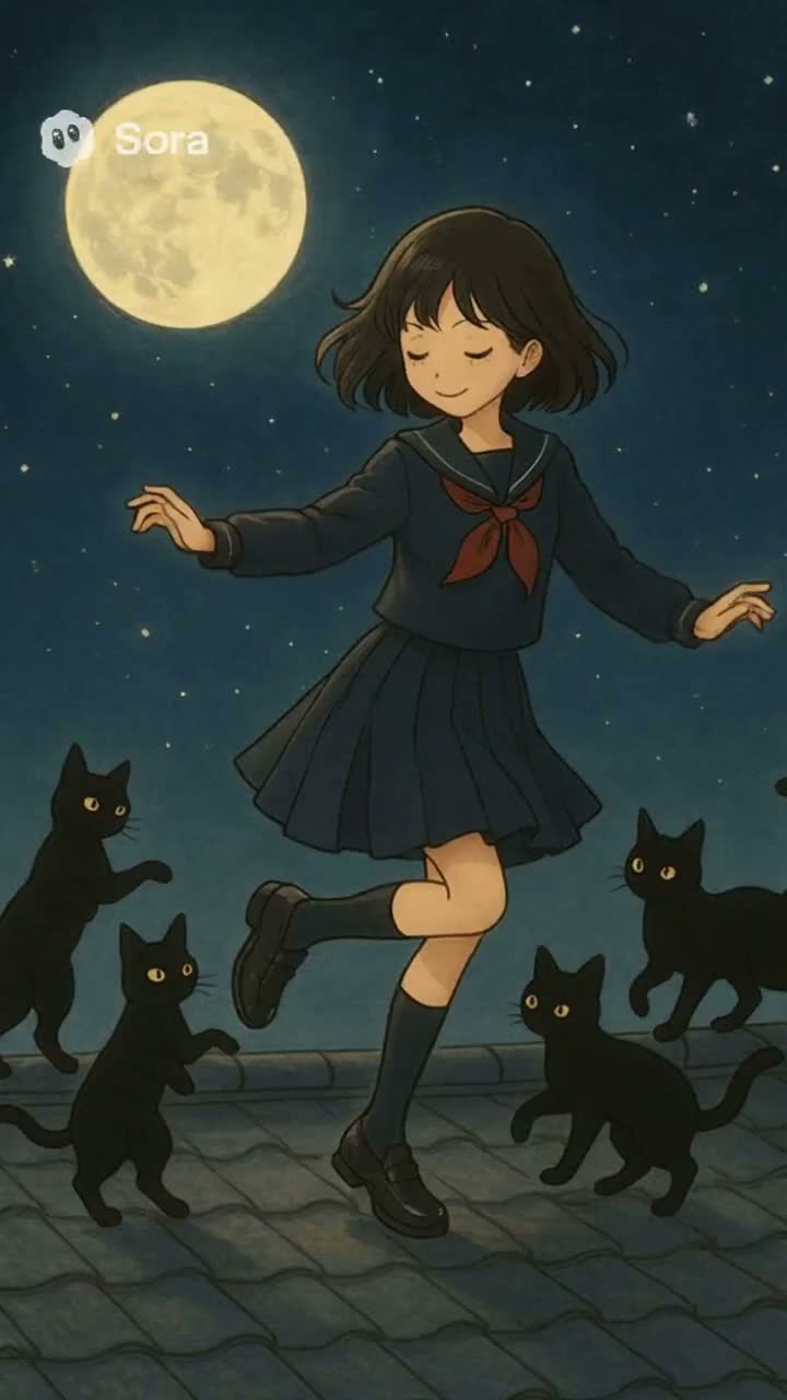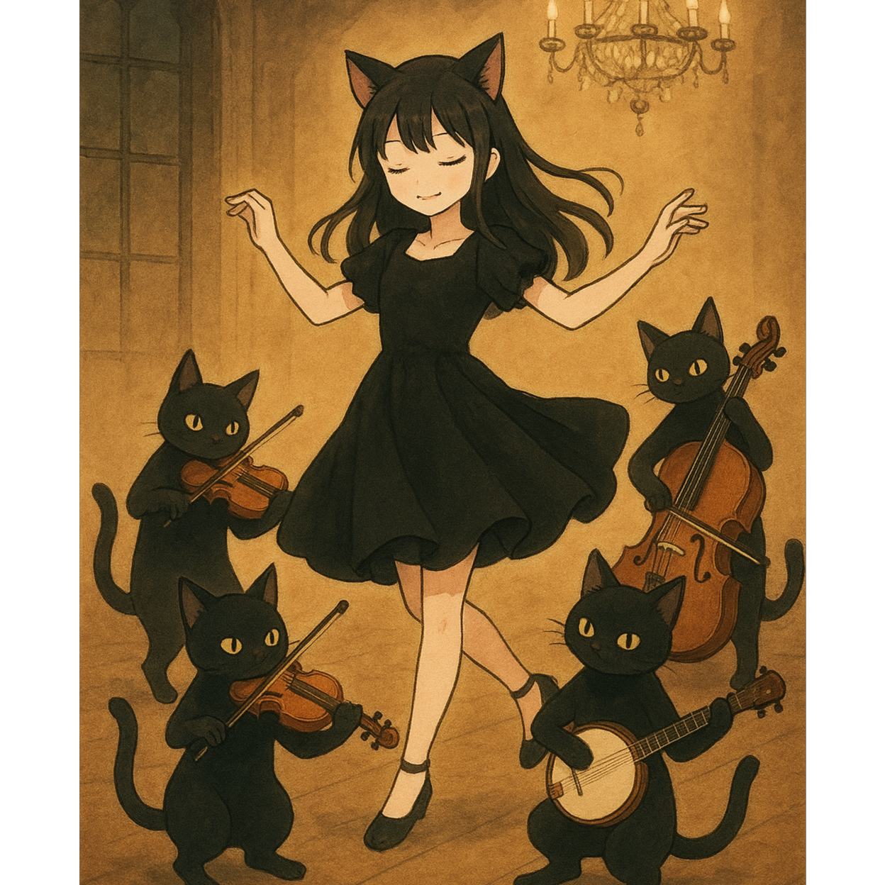 A dreamlike waltz quartet with deep cello bass and gentle piano opens, using black cat purrs and meows as playful rhythmic elements, Verses blend paw taps as delicate percussion, guided by expressive, cat-like phrasing, Chorus merges all instruments for a cute yet elegant texture, Bridge strips to hushed piano and airy strings before leading into a lush, dreamy final chorus, Vocals are soft, nimble, and whimsically feline in tone, ‑Rock guitar riffs, ‑hard rock drums, ‑jazz improvisation solos, ‑blues harmonica, ‑electro house kick, ‑trap hi-hat, ‑country banjo, ‑synthwave elements