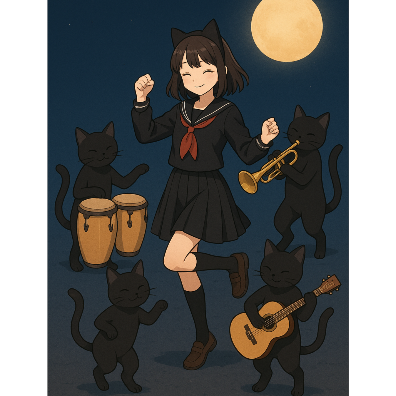 Intro (cat meows + beat build) → Verse (cats preparing for the party) → Chorus (Nyan nyaka iiei!) → Drop (chaotic house groove) → Bridge (dreamy break with echoing meows) → Final Chorus (all cats join the dance)