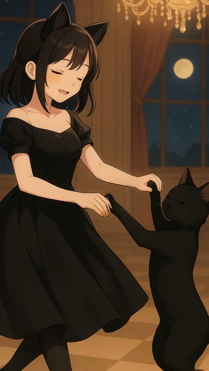 Set at a glamorous ball, the song depicts a black cat gradually approaching its owner through a charming tap dance, The intro begins with light strings and soft piano, while the sound of double bass steps adds elegance, The first chorus expresses the joy of meeting, while the second verse expresses the shifting sense of distance through glances and smiles, The third chorus emphasizes the intimacy of their embrace, Footsteps, bells, and onomatopoeia are skillfully interspersed throughout the verses, A drum roll and whispering strings create a dreamlike moment in the bridge, fading out with a lingering echo, The vocals are beautiful, elegant, and transparent, delivered by a female vocalist, gradually evolving into a sweeter, softer nuance, ‑Rock guitar, ‑hard rock drums, ‑electric bass slap, ‑jazz improvisation solo, ‑blues harp, ‑synthwave elements, ‑deep EDM kicks, ‑Vocaloid-style effects