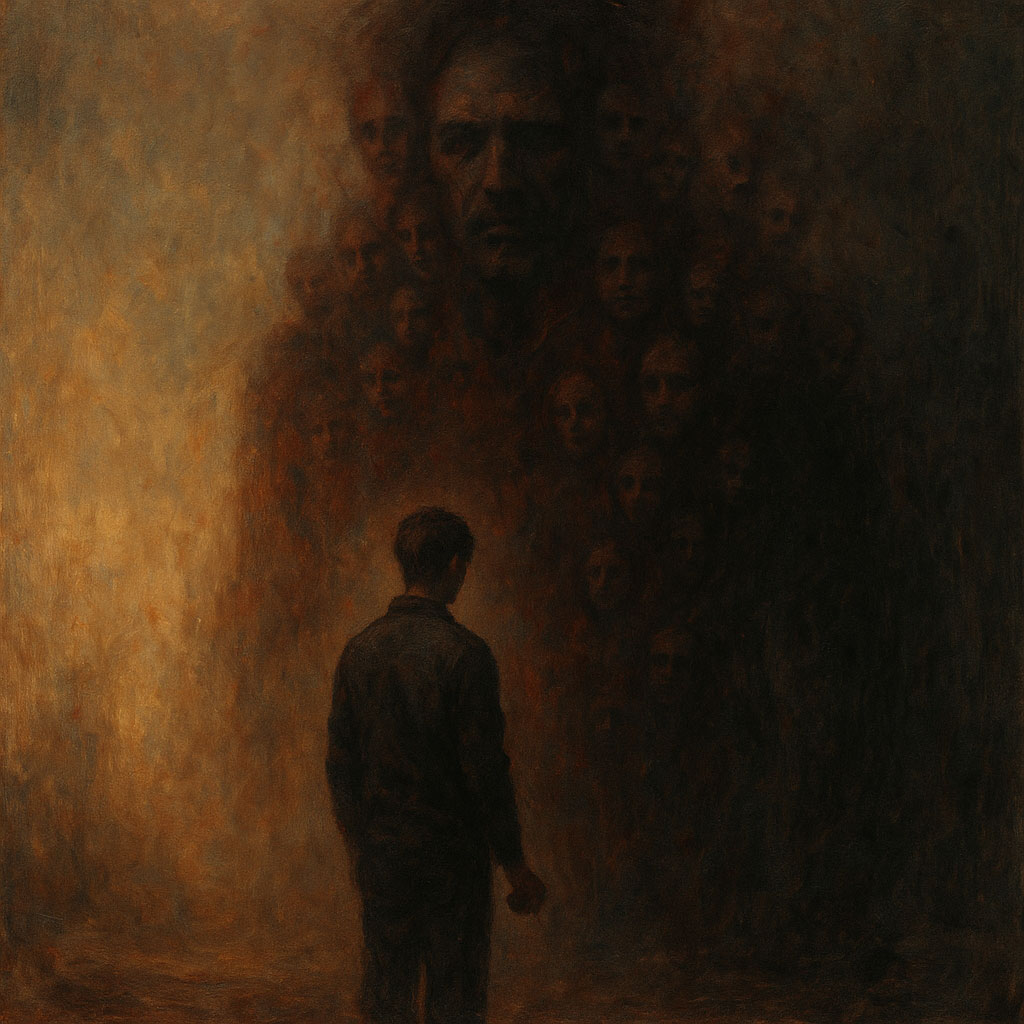 cinematic alt-rock × spoken word hybrid, male dual vocals (baritone + tenor), dark ambient synths, slow tempo 84 bpm, atmospheric guitars, rhythmic piano pulses, mood: dignified × tense × sorrowful, key of D minor, detuned synth drones and static bursts woven with rhythmic stutters, analog tape noise meets digital corruption—memories skipping like scratched vinyl, ghostly choir pads disintegrate into bitcrushed echoes, pulsing sub-bass and distorted percussion mimic failing machinery