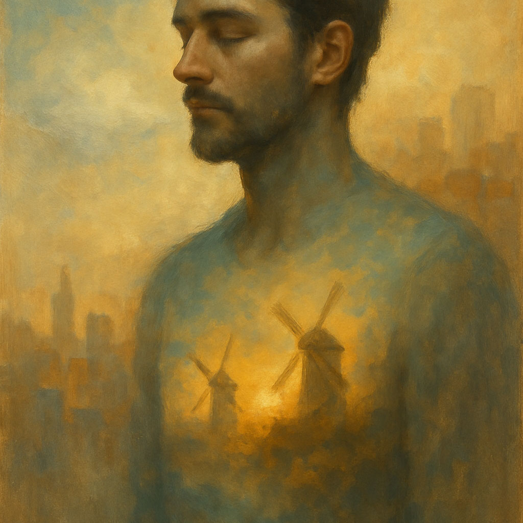 sacred rustic dreamfolk, sparse reverberant guitars, youthful male vocals, soft falsetto layers (mmm), dusty analog textures, minimal tribal percussion, horizon-warm ambience, mood: humble x reverent x introspective, theme: wind and light moving through the soul