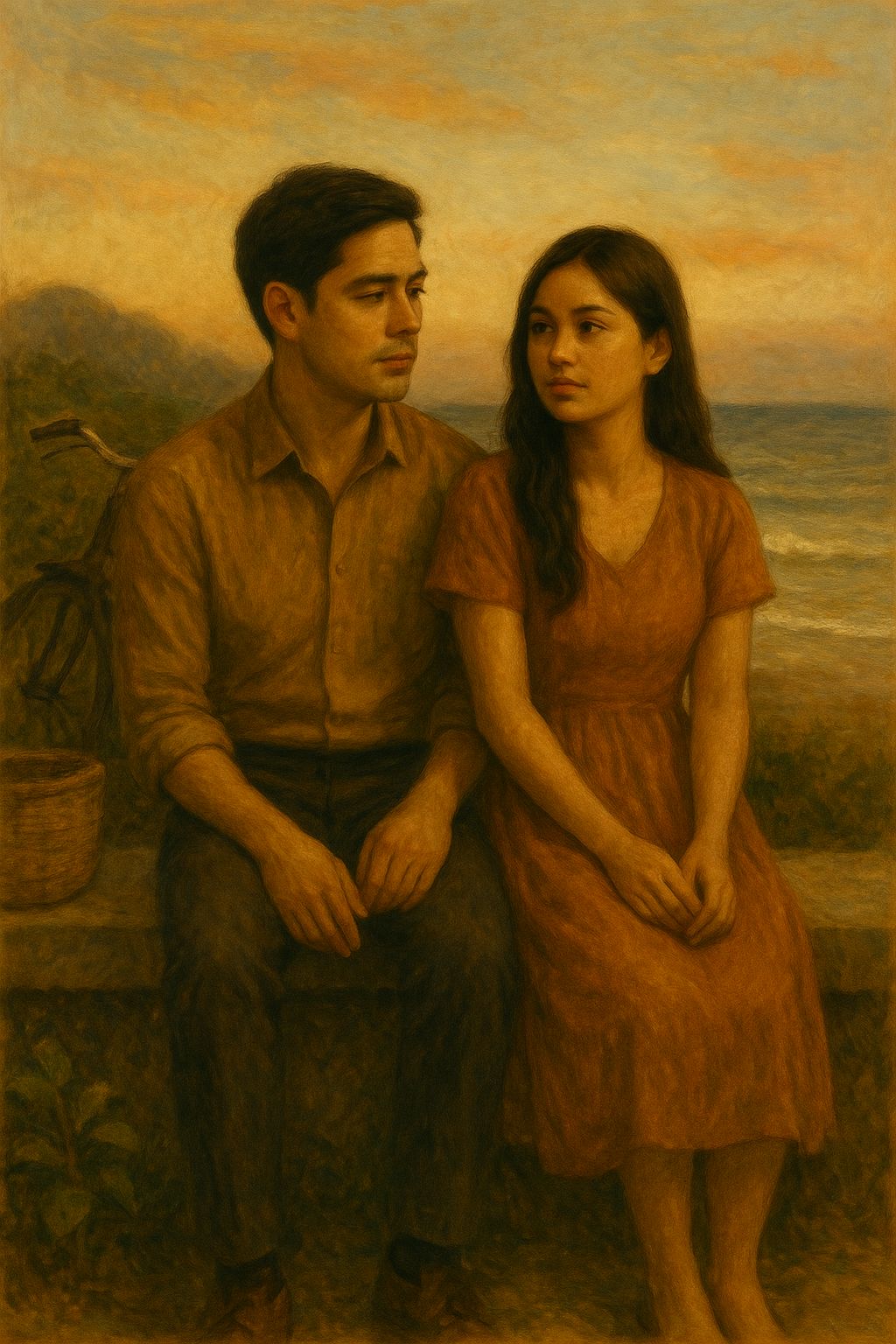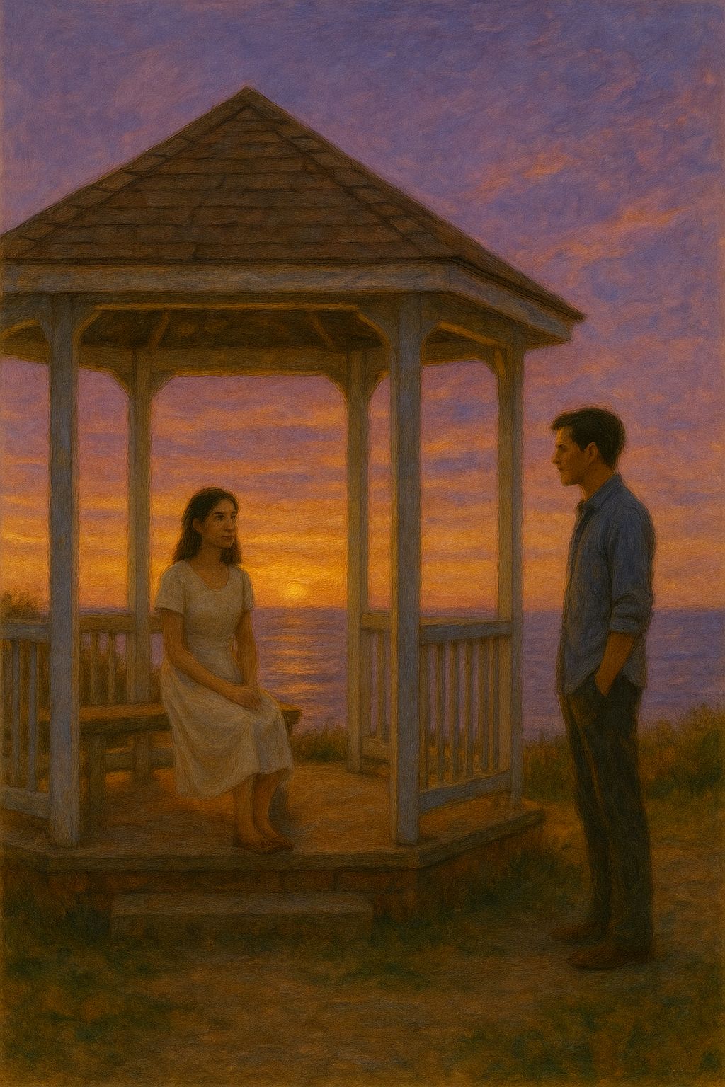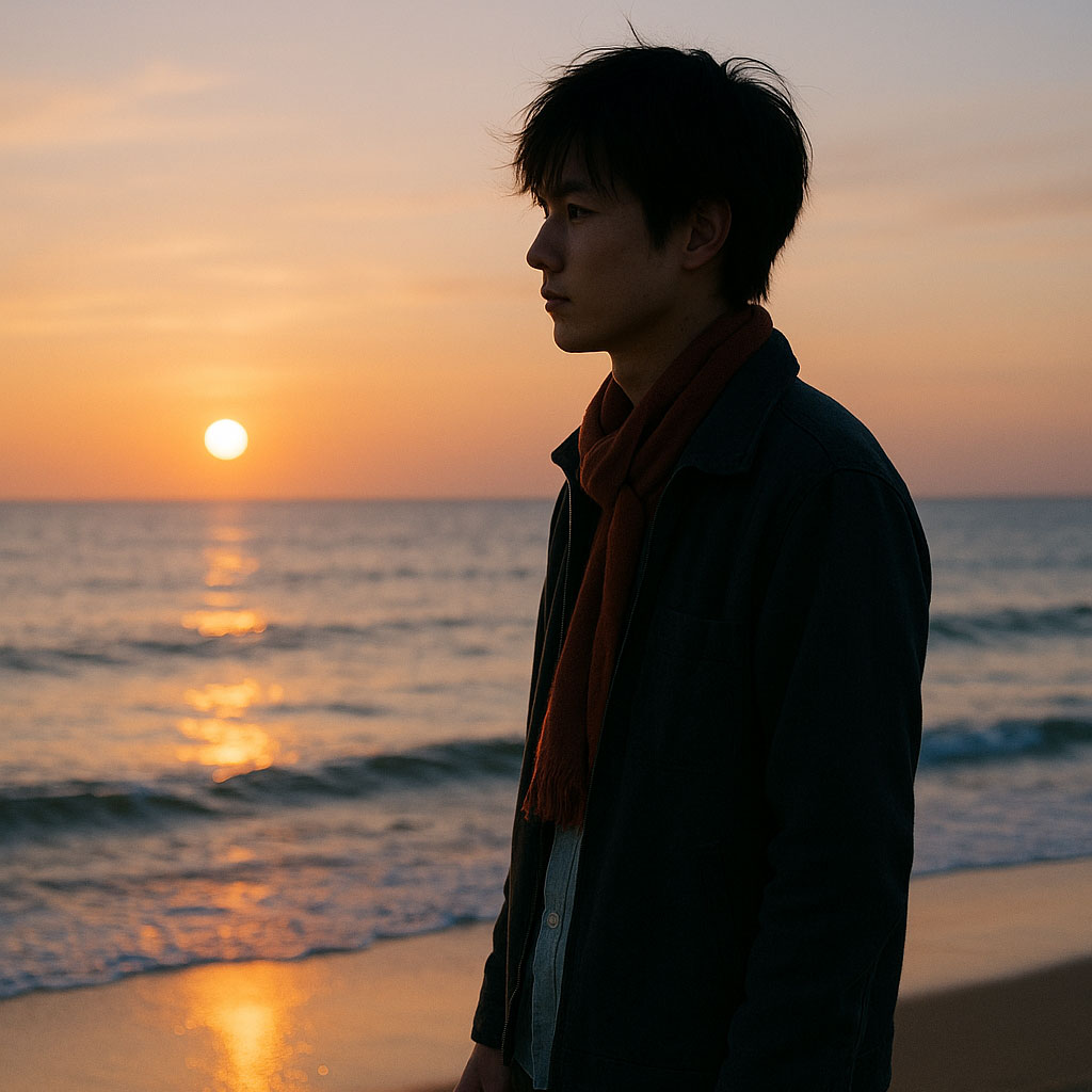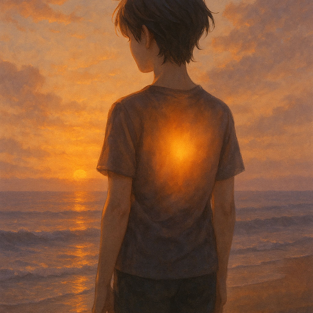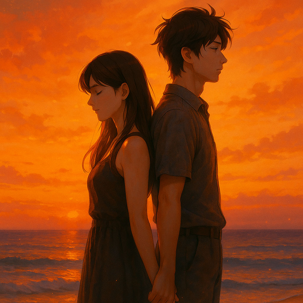 opm, male and female duet, ethereal ritual-folk x cinematic indie fusion, warm acoustic picking, soft analog pads, gritty male main vocals, ethereal female harmonies, slow-bloom crescendos, coastal ambience, orange-hued reverb, emotional first-person storytelling, gentle percussive pulses, wind-textured swells, tender sunset mood, reflective and sacred, tempo ~80–86 bpm, j-country