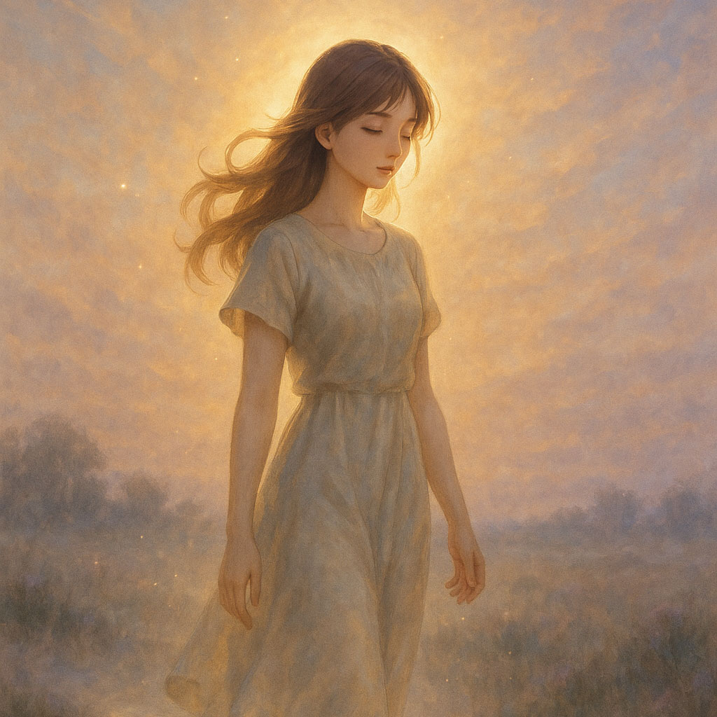 Ethereal acoustic pop, 68 BPM, harp, felt piano, light strings, faint synth pad, Female lead vocal (mezzo-soprano), pure tone, intimate and reflective, Lyrics written as Anna’s inner monologue, echoing Archie’s Repose, Include a short Tagalog line in the refrain [“nandito lang ako”], No percussion beyond light brushed-cymbal swells, Use the same melodic outline as the classical base, Single vocalist only, No sound effects, musical instruments only, [ambience: calm tide, warm horizon glow]