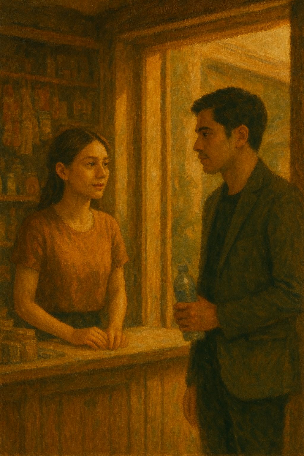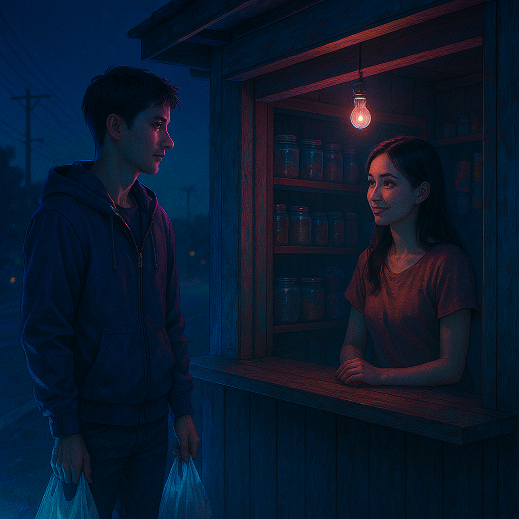 Indie chamber-pop, 84 BPM, nylon guitar, glockenspiel, soft piano, Male lead vocal (light tenor), gentle smile in tone, Very soft head-voice doubles only on replies, One-bar instrumental answers, Add a single Tagalog word at end of verse 1 (salamat), Use the same melody structure as the classical base, Single vocalist only, No sound effects, musical instruments only, [ambience: small receipt, warm light]