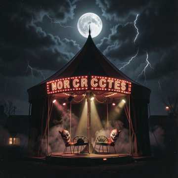145 BPM, Avant-garde Dark Circus Trap, Heavy 808 Sub-Bass, Discordant Calliope Synthesizer, Plucked Staccato Strings, Dry Monotone Male/Female Duet, Surgical Percussion, Crisp Snares, High Dynamic Range, Studio Master, 48kHz, Wide Stereo, No Reverb, Industrial Hip-Hop, Kinetic Energy, Mid-Forward Vocal Mix, Transparent Signal Path, 20Hz-20kHz, ‑lo-fi, ‑shimmering, ‑tapestry, ‑neon, ‑whispers, ‑shadows, ‑echoes, ‑soul, ‑hope, ‑love, ‑peace, ‑dawn, ‑dreams, ‑soft, ‑blurry, ‑acoustic, ‑folk, ‑generic pop, ‑reverb-wash, ‑pads, ‑airy, ‑emotional, ‑hazy, ‑vintage, ‑analog hiss, ‑ai-cliche, ‑utopian-visuals