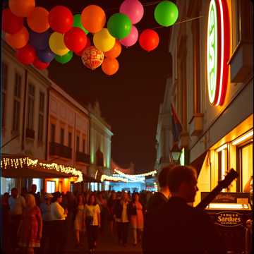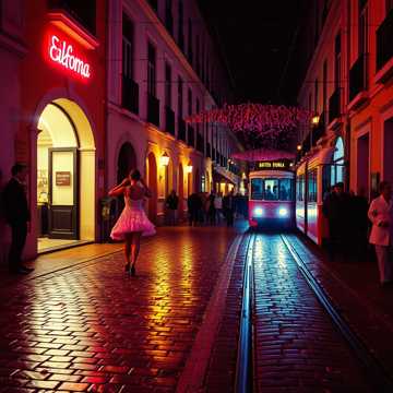 dance, Upbeat Fado-electro hybrid with bright house piano, driving four-on-the-floor kick, and shimmering Portuguese guitar lines; female vocals ride playful topline with catchy call-and-response hooks, Verses stay bouncy and intimate, chorus explodes with stacked harmonies and crowd chants; subtle festival ambience and claps lift the drops, electro, female vocals, happy, fado