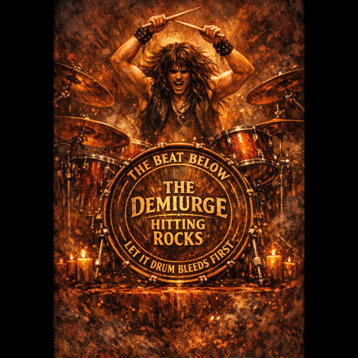 British hard rock 1973, Cozy Powell Dance With The Devil style, RAK Records Mickie Most dry production, Ludwig kit raw power no triggers no samples real skin, drums as lead instrument, snare like a gunshot bass drum physical impact, extended drumbreak solo 5 minutes ritualistic possession ancient force, hypnotic two note guitar riff bass locked underneath, raw chest voice spoken word fading into drums, one final line different voice after drumbreak, massive room sound no artificial reverb, 96 BPM heavy swing, analog warmth LUFS -9, pure British raw power, one kit one room one god