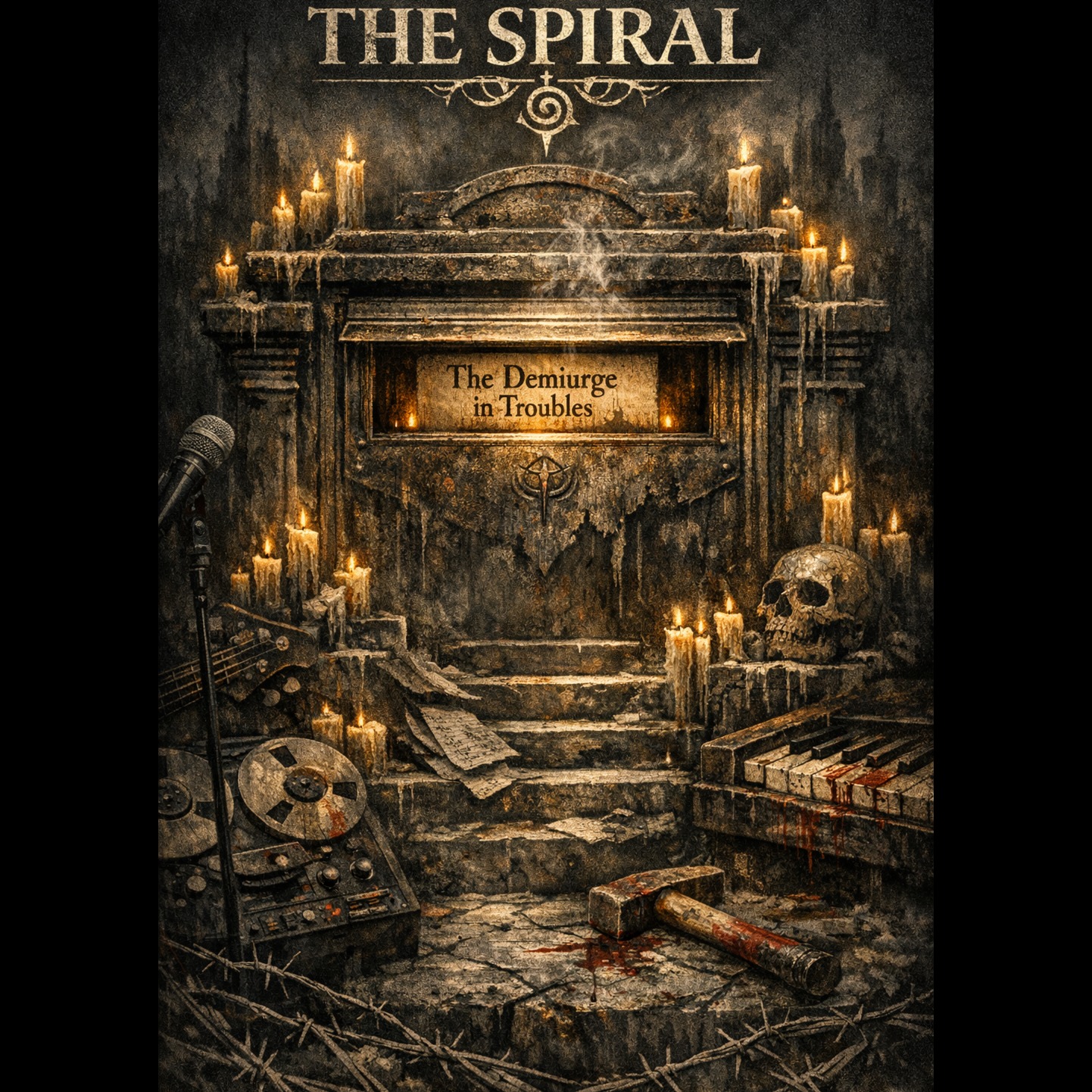 Nick Cave Bad Seeds dark Australian baritone biblical weight, piano hammered sparse dark, Warren Ellis strings funeral slow, bass threatening minimal Justin Chancellor style, drums almost absent then devastating Danny Carey precision, sparse guitar atmosphere not riff, spoken word interruptions direct address to God and enemy, gospel gone wrong murder ballad structure, sorrow without self pity righteous anger quiet voice, Tool Lateralus mathematics 7/4 into 5/4, Johnny Cash stripped to bone every word a verdict, long form no shortcuts no false resolution just endurance, man against the spiral man still standing, 60 BPM funeral pace analog warmth LUFS -11, silence is half the song every word is a stone