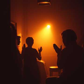 No crowd hype, only subtle human presence: soft breaths, natural pauses, voices blending like guests in a room