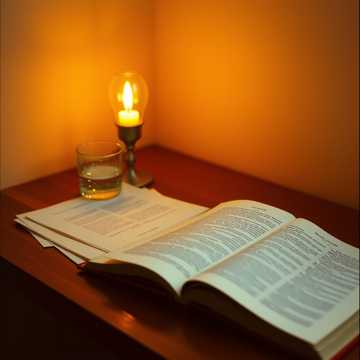 Quiet room ambience, soft light, pages resting on a table, glasses reflecting candle glow, a space where silence is welcome