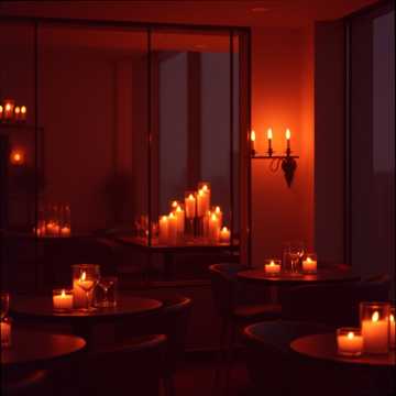 Candlelit room energy, soft reflections on glass, low voices, quiet laughter, a space where conversations and music coexist comfortably
