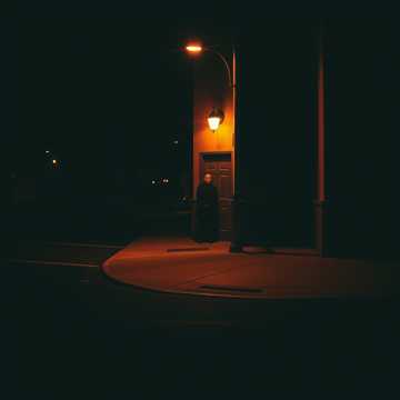 Evening city atmosphere, warm streetlights, reflections on windows, quiet movement at the edges of the room