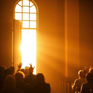 Open indoor space feeling, high ceiling, warm ambient light, a sense of collective presence without crowd noise