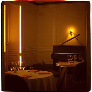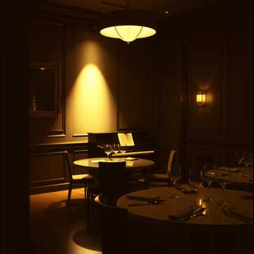 Elegant dinner setting atmosphere, low warm lighting, polished surfaces, quiet conversations blending naturally with the music