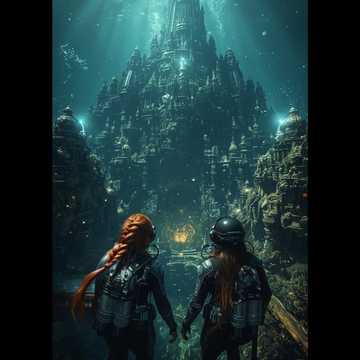 Underwater symphonic/doom metal track, Starts with ambient deep-sea atmosphere: immersive, heavy, calm pressure, glitchy textures like distant creatures, Builds slowly into epic orchestration with layered aquatic sounds, Gregorian chants and grand choirs emerge, evoking awe and the discovery of an ancient submerged civilization, After the bridge, introduce futuristic synth textures, Mass Effect-style, hinting at a highly advanced AI city, Symphonic metal remains dominantβepic, dark, majestic, Complex female vocals, multi-layered, syncopated, ethereal, Rich choral backing, whispers with incomprehensible phrases throughout, adding mystery, Experimental, poly-rhythmic structure with dynamic progression, A sonic journey into the abyss, blending ancient ritual with sci-fi wonder