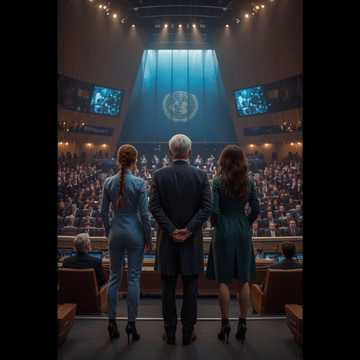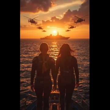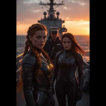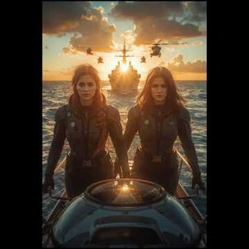 Theatrical and lyrical power metal, flamboyant and heroic yet tinged with operatic absurdity to reflect politics, Fast 7-string guitar riffs with tremolo picking, tight palm-mute tension, liquid tapping, and sweeping arpeggios echoing grandiose gestures, Fretless 6-string bass with sliding watery lines, sometimes independent melodic phrases, Drums: relentless double-kick, blast beats, martial staccato snare rolls, dramatic china/ride crashes, Symphonic orchestra with racing violins, deep cello ostinatos, exaggerated brass chords, mock-Latin choirs evoking an βopera-battle, β Modular synths and alien glitch FX: sonar pulses, distorted transmissions, watery granular swells, Field recordings: waves, bubbles, creaks under pressure, Vocals: soaring female symphonic power metal leads, dramatic male baritone speech-singing, abyssal growls as counterpoint, Massive layered choirs, dissonant at times, Spoken radio commands (compressed, distorted) cut through, with glitch-voiced alien whispers
