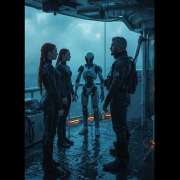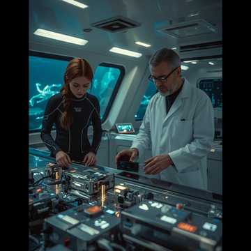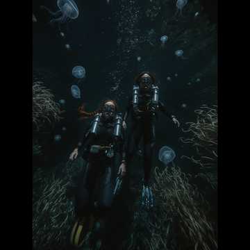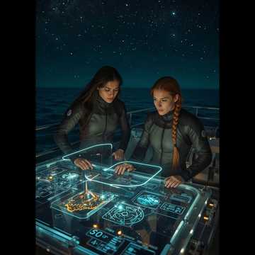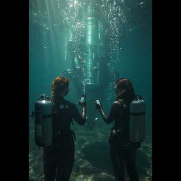 Progressive metal with ambient underwater textures, Irregular time signatures (5/4, 7/8, 13/8) echo the complexity of AI and discovery, Acoustic + electronic drums with deep toms, muted snares, and metal claps, Fretless bass lines, fluid and expressive, Drop C/B guitars play syncopated riffs Γ la Tool/Karnivool β heavy but not aggressive, Subtle aquatic textures: hydrophone recordings, filtered machine hums, deep infinity reverbs mimicking sunken cathedrals, Gregorian male choirs (Latin or abstract phonemes)